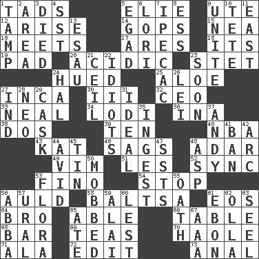 ACROSS 1. Small amounts or degrees 5. Writer Wiesel 9. Shoshoni 12. Originate 14. Republicans 15. Teachers' org. 16. Confronts 17. Ancient Greek god of war 18. ___ a Wonderful Life 19. Writing tablet 20. Being or containing an acid 23. Proofreading order 24. Took on color 25. _ vera 27. South American Indian 30. One more than two 32. Corporate head (abbr.) 33. Be tempered by heat 34. Farming town in central California 36. _ tizzy (2 wds.) 38. Two (Sp.) 39. Nine, plus one 40. Basketball assoc. 43. Krazy ___ of comics 46. Sinks 48. The sixth month of the Jewish calendar 49. Zeal 51. French article 52. Synchronize (abbr.) 53. Fine (Spanish) 54. Close up, plug up 56. Old (Scot.) 58. Greek mezzo-soprano Agnes 61. Greek goddess of the dawn 64. Sis' sibling 65. Competent 66. Eating place 68. Tavern 69. Beverages made from leaves 70. White Person, in Hawaii 71. Chicken ___ king 72. Prepare for publication 73. Of or related to the anus DOWN 1. Pack (down) 2. Length times width 3. Passed on 4. Fast jet (abbr.) 5. Mild oath 6. Australian parrot (variant) 7. Medicinal drug used to evoke vomiting 8. Double-curved letter 9. Join together 10. Wig 11. 90 degrees 13. Son of Isaac 21. To provide with a ceiling 22. Foolish or stupid persons 23. Within a short period 24. Actor Linden 26. Luau accessory 27. Working for oneself (abbr.) 28. Modern: prefix 29. Keg 31. Standard of perfection 35. Swallow 37. Actor Griffith 41. Bar 42. Curve 44. Enthusiastic 45. Metal container 47. Fast planes 48. Cleo's killer 50. Crowded into 53. Plants 55. Pledge 56. Swedish rock group 57. Mountain range 59. Jai _ 60. For fear that 61. Inky black, to poets 62. Water jar 63. Sew up the eyelids of hawks and falcons 65. Had dinner 67. Auto club (abbr.)