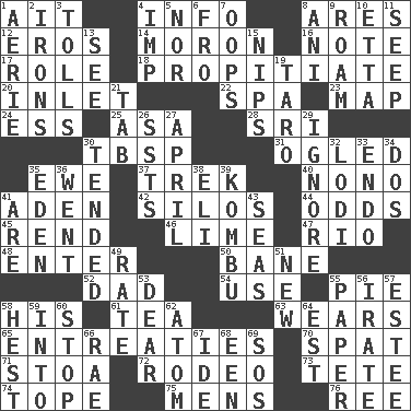 ACROSS 1. Small island 4. Information 8. Ancient Greek god of war 12. Greek god of love 14. Person of subnormal intelligence 16. Musical sound 17. Hero or heavy, e.g. 18. Appease 20. An arm off of a larger body of water 22. Health resort 23. Atlas unit 24. Curvy letter 25. White ___ sheet 28. _ Lanka 30. Cook's measure (abbr.) 31. Stared 35. She-sheep 37. Long journey 40. Words to Nanette 41. Arabian gulf 42. Grain storage towers 44. Probability 45. Tear apart 46. Citrus frut 47. River (Sp.) 48. Keyboard key 50. Object of repulsion 52. June honoree 54. Purpose 55. Sliced dessert 58. Part of HMS, perhaps 61. Afternoon social gathering 63. Puts on (as clothing) 65. Pleas 70. Petty quarrel 71. Portico 72. Cowboy competition 73. Wig 74. Drink excessively 75. Not women's 76. To riddle DOWN 1. Nest on high 2. Metal shackles 3. For Whom the Bell _____ 4. Naughty child 5. Not either 6. From 7. I made a mistake 8. Cuckoo 9. Wander 10. Singer James 11. Ooze 13. Perceive with the eye 15. Pinches, bites 19. Pacific island yam 21. Bar bill 26. Fast planes 27. Showery time 29. Dismiss 30. Watched over 32. Farming town in central California 33. Inside; within (prefix) 34. Two (Sp.) 35. Genesis locale 36. Left 38. Connecticut Ivy Leaguer 39. Dried seaweed eaten as food 41. "We ___ not amused" (Victoria) 43. Oceans 49. Assign a rank or rating to 51. ___ Haven, CT 53. Letter starter 55. Some stationery 56. Feeling or showing extreme anger 57. First name in cosmetics 58. Behest 59. To the inside or interior of 60. Close up, plug up 62. Tiny particle 64. Eastern Standard Time (abbr.) 66. Actress Charlotte 67. Binary compound 68. Car or cant ending 69. Mayday