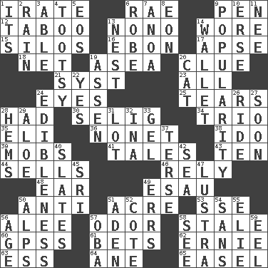 ACROSS 1. Feeling or showing extreme anger 6. Actress Charlotte 9. Fenced enclosure 12. Off limits 13. Words to Nanette 14. Had on 15. Grain storage towers 16. Inky black, to poets 17. Domed church section 18. Fish or hair follower 19. Toward the sea 20. A slight indication 21. System (abbr.) 23. Everything 24. Sight organs 25. Pulls into pieces 28. Possessed 30. Major League Baseball Commissioner Bud 34. Musical group of three 35. Biblical high priest 36. Music written for nine 38. Wedding promise 39. Crowds into 41. Stories 43. "___ Little Indians" 44. Exchanges for money 46. Trust 48. Ewer handle 49. Son of Isaac 50. Against 51. Measure of real estate 53. Compass dir. 56. Toward shelter 57. Aroma 58. Having lost freshness 60. Global Positioning Systems (abbr.) 61. Wagers 62. Bert's buddy 63. Double-curved letter 64. One (Scot) 65. Artist's stand DOWN 1. ___ a Wonderful Life 2. Precipitation 3. Competent 4. A girl or young woman (variant) 5. Greek goddess of the dawn 6. Loose flowing garment 7. Small Philippine buffalo 8. A really long time 9. Teen's desire 10. Celtic language 11. Born 13. A home for chicks 14. Place for singles 19. NE Netherlands city 20. Domesticated feline 22. Consenting reply 24. The property of being fit to eat 26. Travel on an animal 27. Within a short period 28. Is hesitant and indecisive 29. _ vera 31. Car dealer's back yard 32. _ tizzy (2 wds.) 33. Set 37. Laconic 40. Chalkboards 42. Ocean 45. _ Lanka 47. A period of five years 49. Blunders 50. High mountains 51. Arabian gulf 52. ____ d'Azur (French Riviera) 54. Without 55. Writer Wiesel 56. Personal question 57. Chief or king in Benin or Nigeria 58. Perceive with the eye 59. Snakelike fish