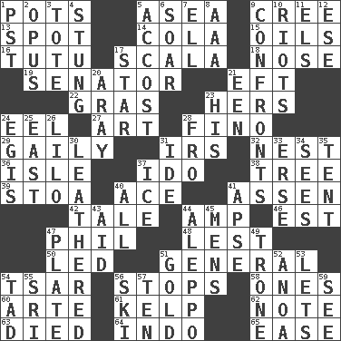 ACROSS 1. Plant holders 5. At sea 9. Algonquian 13. Blemish 14. Root beer relative 15. Petroleums 16. Ballerina skirt 17. Any of the three canals of the cochlea 18. Olfactory organ 19. Legislator 21. Bank Draft (abbr.) 22. Pate de foie ____ 23. Possessive pronoun 24. Snakelike fish 27. Nonscientific branch of learning 28. A pale, very dry sherry 29. Lightheartedly 31. Big collection agency 32. Egg locale 36. Small island 37. Wedding promise 38. Woody plant 39. Portico 40. Adept person 41. NE Netherlands city 42. Falsehood 44. Electrical Unit 46. Eastern Standard Time (abbr.) 47. Silvers or Donahue 48. For fear that 50. Directed 51. Commissioned military rank 54. Russian ruler of old 56. Ceases 58. Singles 60. Johnson of "Laugh-In" 61. Seaweed 62. Observe 63. Passed on 64. Southeast Asian peninsula 65. Relaxation DOWN 1. Pacific Standard Time (abbr.) 2. Musical composition 3. Haul 4. Feeling sharp psychological pain 5. Buttonhole 6. Fly high 7. Pipe bend 8. American Automobile Association (abbr.) 9. Meets 10. Disturbances 11. Raised railways 12. Compass dir. 17. Play the lead 20. Like ___ of sunshine 21. Car or cant ending 23. Part of HMS, perhaps 24. Armor plate that protects the chest 25. 90 degrees 26. _ and Stitch 28. From 30. Tough but pliablecoriaceous 31. Binary compound 33. Celtic language 34. Observes 35. Portable shelter 37. Frozen water 40. Everything 41. Domed church section 43. Help 44. City in Syria 45. Not women's 47. Food holder 49. Marketplace scale 51. Aureate 52. Small Philippine buffalo 53. Allows 54. Small boy 55. _ Lanka 56. What Jean-Claude Killy likes to do 57. Nine, plus one 59. Observe