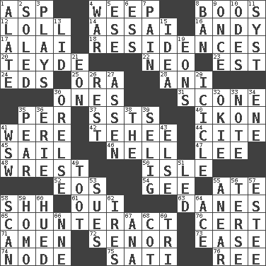 ACROSS 1. Viper 4. Shed a tear 8. Scornful sounds 12. Hang loosely or laxly 14. Slender Brazilian palm 16. Actor Griffith 17. Mountain range southwest of Kyrgyzstan 18. Homes 20. Miss Universe 1986, Barbara Palacios _ 22. Modern: prefix 23. Eastern Standard Time (abbr.) 24. Begley and Asner 25. Mouth or opening 28. Black tropical American cuckoo 30. Washington bills 31. Biscuitlike quick bread 35. For each 37. Fast planes 40. Visual representation of an object 41. Past tense of be (plural) 42. Giggle 44. Quote 45. Travel by water 46. 1994 drama film starring Jodie Foster 47. Area sheltered from the wind 48. Take or capture by force 50. Small island 52. Greek goddess of the dawn 54. Unit of force equal to gravity 55. Had dinner 58. Quiet! 61. Fr. "Yes" 63. Natives or inhabitants of Denmark 65. Neutralize 70. Sure thing 71. So be it 72. Sir (Sp.) 73. Comfort 74. Thickened enlargement 75. Suttee (variant) 76. To sift DOWN 1. Having winglike extensions 2. Having a sole or soles 3. Romps 4. Armed conflict 5. Compass dir. 6. Double-curved letter 7. Ache 8. Bar 9. At one time in the past 10. Lyric poems 11. System (abbr.) 13. Hat (slang) 15. It may be bright or harebrained 19. Immeasurably long periods of time 21. A really long time 26. Respite 27. NE Netherlands city 29. Ice on the eave 30. Threatening words 32. Migrant worker of the '30s 33. Brief written record 34. Compass dir. 35. Lightbulb-shaped fruit 36. One of the Great Lakes 38. Definite Article 39. Former Milwaukee Brewers owner Bud 41. Compass dir. 43. Otherwise 49. A blast of a horn 51. Directed 53. Takes to court 55. Approach 56. Laconic 57. First name in cosmetics 58. Examine minutely or intensely 59. Like (prefix) 60. Became colored 62. Angers 64. Adept person 66. Compass dir. 67. Santa ___, CA 68. Small bed 69. Three (prefix)