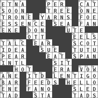 ACROSS 1. Inactive volcano in Sicily 5. For each 8. Feline 11. Within a short period 12. Family _ (genealogy) 14. Single 15. Heavy duty weighing machine 17. Tall tales 18. Enemy 19. Core 21. Ocean 22. Air blower 23. Make supply last 24. Spanish title 25. Shoshoni 27. Baseball player Mel 28. Snakelike fish 31. Baby powder 35. Ewer handle 37. Native of Scotland 38. The content of cognition 39. Take to court 41. Ballerina skirt 42. Lightbulb-shaped fruit 43. Ingest 45. Connect, as a bridge 46. International (abbr.) 47. Be seated 49. Being at a high temperature 51. Epoch 52. Promise 55. One (Scot) 57. It would 60. Small, flat, pigmented spot on the skin 62. Tavern 63. Gives food to 65. Phone greeting 66. Compass dir. 67. Papal veil 68. Downhill vehicle 69. Bit 70. R.R. building 71. Small amounts or degrees DOWN 1. First name in cosmetics 2. Cod relative 3. Trap for birds or small mammals 4. Queen of England 1702-14 5. Parent Teacher Association (abbr.) 6. Blunders 7. French philosopher Descartes 8. Java holder (2 wds.) 9. Small Philippine buffalo 10. Adolescent 13. Son of Isaac 16. Inside; within (prefix) 17. Gossips 20. ____ d'Azur (French Riviera) 26. Trials 29. Globular water bottle used in Asia 30. Surprise greatly 31. Native american tent (variation) 32. An important port of Yemen 33. Resembling or made to resemble leather 34. Monte _, Las Vegas Hotel/Casino 36. Regret 40. Artist's stands 44. Hoop that covers a wheel 48. Hyperbolic tangent 50. Small quarrel 52. Country estate 53. Stared 54. Forest 55. Collude with 56. Grandmother 58. Afternoon social gatherings 59. Gouge 61. Trial 64. ___ good deed