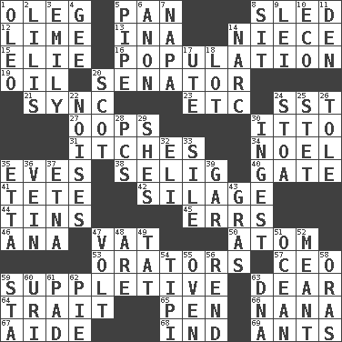 ACROSS 1. Cassini of fashion 5. Baking dish 8. Downhill vehicle 12. Citrus frut 13. _ tizzy (2 wds.) 14. Sibling's daughter 15. Writer Wiesel 16. Census information 19. Lubricate 20. Legislator 21. Synchronize (abbr.) 23. And so on (abbr.) 24. Fast jet (abbr.) 27. I made a mistake 30. "Tell ____ the Marines!" 31. Skin irritations 34. Christmas carol 35. Nights before holidays 38. Former Milwaukee Brewers owner Bud 40. Yard entry 41. False hair 42. Fodder prepared in a silo 44. Airtight sealed metal containers 45. Blunders 46. Santa ___, CA 47. Large container 50. Smallest unit of an element 53. Speakers 57. Corporate head (abbr.) 59. Supplementary 63. Letter starter 64. Distinguishing feature 65. Animal enclosure 66. Nanny 67. Assistant 68. Indiana (abbr.) 69. Pismires DOWN 1. Butter sub 2. Ms. Damita and namesakes 3. Poet Dickinson 4. Unit of force equal to gravity 5. Corncob 6. Soon (poet.) 7. California wine valley 8. Be seated 9. Flowery wreath 10. Environmental prefix 11. Lair 14. Drug cop 17. Shoshoni 18. Car dealer's back yard 20. Native of Scotland 22. Annoying sounds 24. Portico 25. Proofreading order 26. Lacquered or enameled metalware 28. Personal Computers (abbr.) 29. "______ My Girl" (Turtles hit) 30. Eat 32. Biblical high priest 33. Filth; sediment 35. Singer James 36. Distinctive style or manner 37. Inactive volcano in Sicily 39. Slender fish 43. Pate de foie ____ 47. Electrical Unit 48. "We ___ not amused" (Victoria) 49. Make lace 51. Sea 52. Intended 54. Native american tent (variation) 55. Baking chamber 56. Tear apart 58. Mouths or openings 59. R.R. building 60. RI univ. 61. Groovy apt. 62. Sliced dessert 63. Heredity factor (abbr.)
