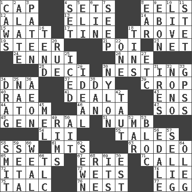 ACROSS 1. Head covering 4. Puts into a specified state 8. Snakelike fish 12. Chicken ___ king 13. Writer Wiesel 14. "This won't hurt ____!" 15. Electrical Unit 17. Prong on a fork 18. Collection of objects 19. Navigate 21. Luau course 23. Fish or hair follower 24. World-weariness 26. Compass dir. 28. Tenth: prefix 30. Nestling 34. Heredity factor (abbr.) 37. Whirlpool 39. Riding implement 40. Actress Charlotte 41. Started a card game 43. Followers of ems 44. Tiny particle 46. Small Philippine buffalo 47. Distress signal 48. Commissioned military rank 51. Unfeeling 54. Cards in a Roman deck? 55. Falsehoods 58. Compass dir. 61. Mountains (abbr.) 63. Cowboy competition 65. Confronts 67. One of the Great Lakes 71. Give a ring to 72. Slanted text style (abbr.) 73. Moistens 74. Untruth 75. Baby powder 76. A home for chicks 77. Ovum DOWN 1. Crow sounds 2. Having winglike extensions 3. Eucharist need 4. Arrange properly for use 5. Biblical high priest 6. Shallow baking pan 7. Ooze 8. Ewer handle 9. Inky black, to poets 10. Moving, as bait 11. Proofreading order 16. Look after 18. Airtight sealed metal containers 20. Sorrow 22. Single 25. On the rocks 27. And so on (abbr.) 29. Perfect 30. Thermoplastic polyamide 31. Angers 32. Words to Nanette 33. Global Positioning Systems (abbr.) 34. To draw with force 35. Nathan's nickname 36. Period of immesurable duration 38. Daniel's nick name 42. Tense 45. Cartoonist voice _ Blanc 49. Basketball hoops 50. Small island 52. Spoil 53. Alliance 56. Peak District village in England 57. Former Milwaukee Brewers owner Bud 58. Stricken, poetically 59. Bristle 60. Welt 62. Stitched 64. Cassini of fashion 66. Affectionate concern, for short 68. To sift 69. ___ a Wonderful Life 70. Eastern Standard Time (abbr.)