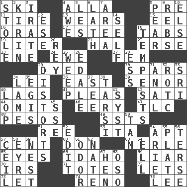 ACROSS 1. What Jean-Claude Killy likes to do 4. Silent film actress Nazimova 8. Before (prefix) 11. Become fatigued 13. Puts on (as clothing) 15. Snakelike fish 16. Mouths or openings 17. First name in cosmetics 18. Bar bills 19. 61 cubic inches 21. Actor Linden 22. Celtic language 23. Compass dir. 24. She-sheep 27. Opposite of masc. 29. Colored 30. Practice fights 34. Luau accessory 36. 90 degrees 39. Sir (Sp.) 40. Fails to keep up a pace 41. Entreaties 43. Suttee (variant) 44. Leaves out 46. Suggestive of the supernatural 47. Affectionate concern, for short 48. Mexican monetary units 49. Fast planes 51. To separate or throw off 53. Call ___ day 54. Fitting 57. Penny 60. Spanish title 63. Haggard of country music 65. Sight organs 66. Potato state 69. One who doesn't tell the truth 70. Big collection agency 71. Hauls 72. Allows 73. Allow 74. Western Nevada city 75. Area sheltered from the wind DOWN 1. Fur scarf 2. Japanese brewing company 3. Feeling or showing extreme anger 4. Deep reverence 5. French article 6. Thin strip of wood or metal 7. Type of rug 8. Lightbulb-shaped fruit 9. Confederate soldiers (slang) 10. Otherwise 12. Compass dir. 14. Oneself 18. Storms 20. Marina Del _, California 25. Shed a tear 26. Peak District village in England 28. Curvy letter 29. What propaganda does 31. Of or related to the anus 32. College mil. group 33. Indian title of respect (Mr.) 34. Unable to walk 35. The front part of a cuirass 37. Observe 38. Tarsus (plural) 40. Chop off 42. System (abbr.) 45. Compass dir. 50. Scottish cap 52. Prepare for publication 54. Satellite of Uranus 55. Food holder 56. Laconic 57. To provide with a ceiling 58. Jane of fiction 59. Egg locale 61. Aroma 62. Nathan's nickname 64. Pipe bend 67. Layer 68. Bear (Spanish)