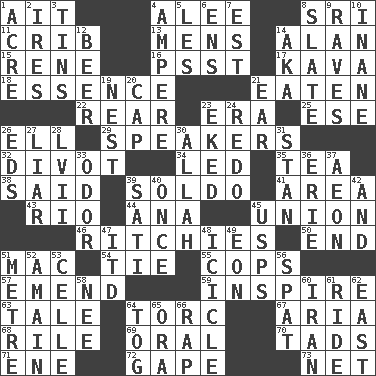 ACROSS 1. Small island 4. Toward shelter 8. Indian title of respect (Mr.) 11. Baby bed with high sides 13. Not women's 14. Actor Alda or Thicke 15. French philosopher Descartes 16. Inconspicuous attention getter 17. Polynesian shrub of the pepper family 18. Core 21. Consumed 22. Located in or toward the back 23. Period 25. Compass dir. 26. Pipe bend 29. Orators 32. A piece of turf (Scot.) 34. Directed 35. Afternoon social gathering 38. Stated 39. Twentieth part of a lira 41. Type of rug 43. River (Sp.) 44. Santa ___, CA 45. The state of being joined or united 46. Actors Guy, Robert Welles, and Clint 50. Conclude 51. Big _ 54. Make a knot 55. 911 reaches them 57. Make improvements or corrections to 59. Heighten or intensify 63. Lie 64. Torque (variant) 67. Roberta Peters solo 68. Cause heat under the collar 69. Of the mouth 70. Bits 71. Compass dir. 72. Stare wonderingly 73. Remaining after all deductions DOWN 1. Measure of real estate 2. Angers 3. Canisters 4. Electrical Unit 5. French article 6. Followers of ems 7. Eastern Standard Time (abbr.) 8. Chalkboard 9. All-night dance parties 10. Lacking in sense or substance 12. Fermented drink made from hops 14. Alias (abbr.) 19. A home for chicks 20. Head covering 21. Ewer handle 23. Made supply last 24. Make new 26. Begley and Asner 27. One who doesn't tell the truth 28. 57 in ancient Rome 30. Assad's deity 31. Comedian Laurel of Laurel & Hardy 33. Scent 36. 4th largest of the Great Lakes 37. Period of immesurable duration 39. Suttee (variant) 40. Single time 42. Added to 45. United States Postal Service (abbr.) 47. It would 48. Ice on the eave 49. A really long time 51. Distance measurement (Brit.) 52. With great haste 53. Cell (Danish) 56. Petty quarrel 58. Born 60. SW Asia republic 61. Travel on or in a vehicle 62. 90 degrees 64. Coat; cloak 65. Mouth or opening 66. Strike
