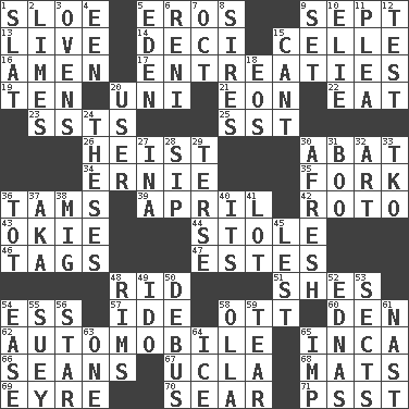 ACROSS 1. _ gin 5. Greek god of love 9. Back-to-school mo. 13. Not recorded 14. Tenth: prefix 15. Cell (Danish) 16. So be it 17. Pleas 19. Nine, plus one 20. Single; one (prefix) 21. Period of immesurable duration 22. Erode 23. Fast planes 25. Fast jet (abbr.) 26. Robbery 30. Blind as ____ 34. Bert's buddy 35. Tined utensil 36. Scottish caps 39. Showery time 42. Printing process, for short 43. Migrant worker of the '30s 44. Took without asking 46. Labels 47. _____ Park, CO 48. To free from 51. "______ My Girl" (Turtles hit) 54. Curvy letter 57. Binary compound 58. Baseball player Mel 60. Lair 62. Car 65. South American Indian 66. Seines 67. Southern CA. univ. 68. Floor coverings 69. Jane of fiction 70. Burn superficially 71. Inconspicuous attention getter DOWN 1. Narrow board 2. Citrus fruits 3. Baking chambers 4. Car or cant ending 5. Locale of original sin 6. Painter Guido (1575-1642) 7. Sep. follower 8. Titles for men of rank and authority 9. Arrange properly for use 10. Writer Wiesel 11. Entreaty 12. Trial 15. Patter 18. Greek goddess of the dawn 20. One who uses or employs something 24. College papers 27. _ tizzy (2 wds.) 28. Small drink 29. Laconic 30. Anew 31. Surprise greeting 32. Nonscientific branch of learning 33. Ring climax 36. Small child 37. Alias (abbr.) 38. Russian fighter aircraft 40. It is 41. Car dealer's back yard 45. For fear that 48. Basketball hoops 49. Wedding promise 50. To get out of a bus 52. Ferber et al. 53. Religious groups 54. Comfort 55. Chop _ 56. Play the lead 58. Spanish pot 59. Separate forcefully 61. Political cartoonist Thomas 63. Single 64. Frozen water 65. Mischievous child