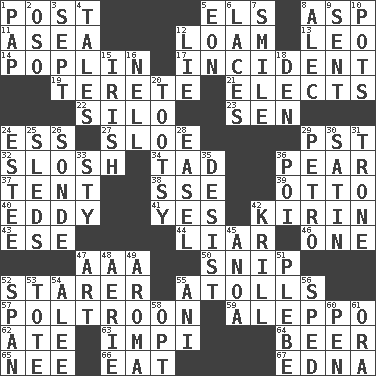 ACROSS 1. Mail 5. Raised railways 8. Viper 11. Toward the sea 12. Rich soil 13. Lion 14. Cotton for raincoats, e.g. 17. Happening 19. Cylindrical with tapered ends 21. Opts 22. Grain storage tower 23. Elected rep. 24. Double-curved letter 27. A type of plum 29. Pacific Standard Time (abbr.) 32. Agitate, as a liquid 34. Small amount or degree 36. Lightbulb-shaped fruit 37. Portable shelter 38. Compass dir. 39. Von Bismarck 40. Whirlpool 41. Affirmative reply 42. Japanese brewing company 43. Compass dir. 44. One who doesn't tell the truth 46. Single 47. American Automobile Association (abbr.) 50. Sever or remove by pinching or nipping 52. A viewer who gazes fixedly 55. Ringlike coral islands and reefs 57. Coward 59. City in Syria 62. Had dinner 63. Body of Kaffir warriors 64. Fermented drink made from hops 65. Born 66. Erode 67. Pulitzer Prize-winning author Ferber DOWN 1. Infant food 2. Bear (Spanish) 3. Back-to-school mo. 4. Lies 5. Period of immesurable duration 6. Shoestrings 7. Grin 8. Actor Baldwin 9. Emitted 10. Cooking vessels 12. Falsehood 15. From or relating to Ireland 16. 1994 drama film starring Jodie Foster 18. Lair 20. A girl or young woman (variant) 24. First name in cosmetics 25. Bobsleighs 26. Something which is sent 28. Artist's stand 29. Stone: prefix 30. Smooth fabric 31. Heavy duty weighing machine 33. Filthy place 35. Stop 36. Luau course 42. The principal food of baleen whales 45. Small Philippine buffalo 47. Tate display 48. Nest on high 49. Scent 51. Cadet 52. Connect, as a bridge 53. Carryall 54. Toward shelter 55. Cuckoo 56. Hurried 58. Elect 60. Writing instrument 61. Mouth or opening