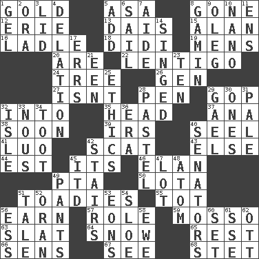 ACROSS 1. Gilded 5. White ___ sheet 8. Went 12. 4th largest of the Great Lakes 13. Raised platform 15. Actor Alda or Thicke 16. Dipping utensil 18. "You Light Up My Life" star Conn 19. Not women's 20. "We ___ not amused" (Victoria) 22. Small, flat, pigmented spot on the skin 24. Family _ (genealogy) 26. Commissioned military rank (abbr.) 27. Is not 28. Writing instrument 29. Grand Old Party 32. To the inside or interior of 35. Froth on beer 37. Santa ___, CA 38. Within a short period 39. Big collection agency 40. Sew up the eyelids of hawks and falcons 41. Nilotic language 42. Leave at once 43. Otherwise 44. Eastern Standard Time (abbr.) 45. ___ a Wonderful Life 46. Liveliness 49. Parent Teacher Assoc. 50. Globular water bottle used in Asia 51. Sycophants 55. Small child 56. Merit 57. Hero or heavy, e.g. 59. With motion or animation 63. Narrow board 64. Frozen precipitation 65. Relief 66. Elected reps. 67. Perceive with the eye 68. Proofreading order DOWN 1. Set 2. Mouth or opening 3. Hat (slang) 4. Conveyance 5. Increase 6. Travel by water 7. Assistant 8. Homeless child 9. Cassini of fashion 10. Billionth: prefix 11. Followers of ems 14. Scorched 17. Blunders 21. Car or cant ending 23. "___ Little Indians" 25. Moral principles 28. Soft color 29. Highlander 30. Singles 31. Light colored 32. Capri or Wight 33. Horse sense 34. A blast of a horn 36. Period 40. Elected representatives 42. Flight of steps 45. It would 47. Car dealer's back yard 48. Smallest unit of an element 49. Leg coverings 51. Lie 52. Northwest Algerian city 53. Immeasurably long periods of time 54. _ gin 56. Double-curved letter 58. She-sheep 60. Put into a specified state 61. Compass dir. 62. Baseball player Mel