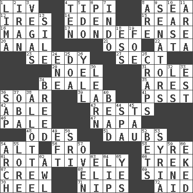 ACROSS 1. 54 in ancient Rome 4. Native american tent (variation) 8. Toward the sea 12. Angers 14. Genesis locale 15. Stern 16. Wise men 17. Unrelated to defense, as in spending 20. Of or related to the anus 21. Bear (Spanish) 22. "One Day ___ Time" 23. Sleazy 27. Religious group 29. Christmas carol 31. Hero or heavy, e.g. 34. Memphis, Tenn. Street 35. Ancient Greek god of war 36. Fly high 39. Experiment locale 41. Inconspicuous attention getter 42. Competent 43. Musical pauses 46. Diluted with white 47. California wine valley 48. Lyric poems 51. Applies to a surface 54. Keyboard modifier key 56. From 58. Jane of fiction 61. Producing rotation 66. Long journey 67. Ship's personnel 68. Writer Wiesel 69. Trig term 70. Person who is morally reprehensible 71. Pinches, bites 72. Assist DOWN 1. Pale green bean 2. SW Asia republic 3. Viva Las _ 4. Nine, plus one 5. Wedding promise 6. Writing instrument 7. _ china 8. "We ___ not amused" (Victoria) 9. Legislators 10. 90 degrees 11. Length times width 13. Filth; sediment 18. Double-curved letter 19. Enemy 24. Compass dir. 25. ___ good deed 26. Shout 28. Dice game 30. Memorize 32. French article 33. Eastern Standard Time (abbr.) 34. A special lineage 36. Plant excrement 37. Chief or king in Benin or Nigeria 38. One to whom something is allotted 40. Necklace unit 44. Health resort 45. The 19th letter of the Greek alphabet 49. Newt 50. Indian title of respect (Mr.) 52. Antes 53. Damascus' land 54. Bowlike part 55. Old wives' tales, e.g. 57. Baking chamber 59. Painter Guido (1575-1642) 60. Supplemented with great effort 62. Leather borer 63. Biblical high priest 64. Mouth edge 65. Consenting reply