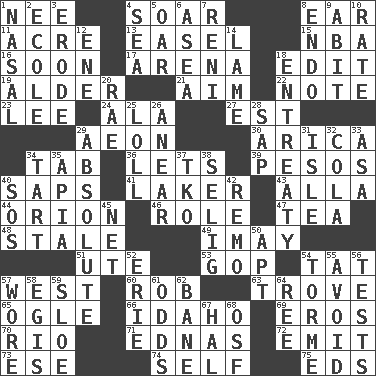 ACROSS 1. Born 4. Fly high 8. Ewer handle 11. Measure of real estate 13. Artist's stand 15. Basketball assoc. 16. Within a short period 17. Sports stadium 18. Prepare for publication 19. Tree or shrub in the Birch family 21. Direct toward a target or goal 22. Make mention of 23. Area sheltered from the wind 24. Insect wing 27. Eastern Standard Time (abbr.) 29. A really long time 30. N. Chile seaport 34. Bar bill 36. Allows 39. Mexican monetary units 40. Plant excrements 41. Member of a famous L.A. basketball team 43. Silent film actress Nazimova 44. Greek mythologigal hunter 46. Hero or heavy, e.g. 47. Beverage made from leaves 48. Having lost freshness 49. "If ____ say so..." 51. Shoshoni 53. Republican Party 54. Make lace 57. Compass direction 60. Director Reiner 63. Collection of objects 65. Stare 66. Potato state 69. Greek god of love 70. _ de Janeiro 71. Ferber et al. 72. Give off 73. Compass dir. 74. Oneself 75. Begley and Asner DOWN 1. Rhinal 2. Learning spot: Fr. 3. Eat (away) 4. Ocean 5. Rowing implement 6. At sea 7. Painter Guido (1575-1642) 8. Inside; within (prefix) 9. "This won't hurt ____!" 10. Pace 12. Compass dir. 14. Unable to walk 18. Plea 20. Actress Charlotte 25. Hang loosely or laxly 26. Approach 28. Plant excrement 29. Utter; complete 31. Capri or Wight 32. Root beer relative 33. White ___ sheet 34. Small pie 35. Capital of Western Samoa 37. Ring climax 38. Former Milwaukee Brewers owner Bud 40. Mayday 42. San ____ (Riviera town) 45. Fish or hair follower 50. Fitting 52. 4th largest of the Great Lakes 54. Singer Mel 55. Prevent the occurrence of 56. Trials 57. Had on 58. The front part of a cuirass 59. _ gin 61. Probability 62. Object of repulsion 64. To sift 67. Actor Linden 68. Order of Saint Francis (abbr.)