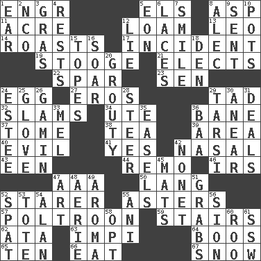 ACROSS 1. Engineer (abbr.) 5. Raised railways 8. Viper 11. Measure of real estate 12. Rich soil 13. Lion 14. Cooks with dry heat, as in an oven 17. Happening 19. Moe Howard, for one 21. Chooses 22. Coast Guard woman 23. Elected rep. 24. Oval reproductive body of a fowl 27. Greek god of love 29. Small amount or degree 32. Hits or strikes with great force 34. Shoshoni 36. Object of repulsion 37. Heavy book 38. Afternoon social gathering 39. Length times width 40. Morally bad or wrong 41. Affirmative reply 42. Rhinal 43. Car or cant ending 44. San ____ (Riviera town) 46. Big collection agency 47. American Automobile Association (abbr.) 50. Austrian-born American filmmaker Fritz 52. A viewer who gazes fixedly 55. Michaelmas daisies 57. Characterized by complete cowardliness 59. Flight of steps 62. _ moment's notice (2 wds.) 63. Body of Kaffir warriors 64. Scornful sounds 65. Nine, plus one 66. Erode 67. Frozen precipitation DOWN 1. Hearing organ 2. Non-commissioned officer (abbr.) 3. Pate de foie ____ 4. Musical pauses 5. Period of immesurable duration 6. Shoestrings 7. Grin 8. Actor Baldwin 9. Posted 10. Plant holders 12. Whopper 15. Drinks excessively 16. Fly high 18. Lair 20. Sulky 24. First name in cosmetics 25. Michael Jackson trademark 26. Homeless child 28. Bull 29. Tarsus (plural) 30. Approach 31. Allots cards 33. Cartoonist voice _ Blanc 35. Artist's stands 36. Sound made by sheep 42. Music written for nine 45. Floor protectors 47. Nonscientific branch of learning 48. Nest on high 49. Odor 51. Takes hold of 52. Argument over a trivial matter 53. Carry 54. Actor Alda or Thicke 55. Black tropical American cuckoo 56. The Jewish people; Israel 58. Elect 60. Friend of Pooh 61. Compass dir.