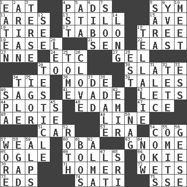 ACROSS 1. Erode 4. Writing tablets 8. Symbol (abbr.) 11. Ancient Greek god of war 13. Not moving 15. "___ Maria" 16. Become fatigued 17. Off limits 18. Woody plant 19. Artist's stand 21. Elected rep. 22. 90 degrees 23. Compass dir. 24. And so on (abbr.) 27. Set 29. Implement 30. Chalkboard 34. Make a knot 36. Method 39. Lies 40. Droops 41. Elude 43. Allows 44. Small pieces of grounds 46. Dutch treat 47. Frozen water 48. Nest on high 49. Actor's bit 51. 4-wheeled motor vehicle 53. Epoch 54. Gear tooth 57. Welt 60. Chief or king in Benin or Nigeria 63. Dwarf 65. Stare at amorously 66. For Whom the Bell _____ 69. Migrant worker of the '30s 70. Strike 71. Simpsons dad 72. Soaks 73. Begley and Asner 74. Suttee (variant) 75. Compass dir. DOWN 1. Consumed 2. Believer in; advocate of (suffix) 3. Laconic 4. Pacific Standard Time (abbr.) 5. _ moment's notice (2 wds.) 6. Claim 7. _ gin 8. "Two Mules for Sister ____" 9. Jacques Cousteau's middle name 10. Rendezvous 12. Perceive with the eye 14. Yearn 18. Copy Pinocchio 20. Lion 25. Heavy book 26. Garlic unit 28. Eastern Standard Time (abbr.) 29. One of the two male reproductive glands 31. Actor Baldwin 32. Wig 33. Curvy letter 34. Story 35. Russian composer Stravinsky 37. June honoree 38. Peak District village in England 40. Health resort 42. Arab leader 45. Ocean 50. Tired old horse 52. Writer of Portnoy's Complaint (1969) 54. Popular sodas 55. Leaves out 56. Honkers 57. Had on 58. Mild oath 59. High mountains 61. Scornful sounds 62. _ mater 64. At this time 67. Allow 68. Indian title of respect (Mr.)
