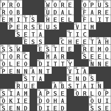 ACROSS 1. Adept person 4. Had on 8. Musical composition 12. Director Reiner 13. Freehold land 14. Conductor's collection 15. Sends forth 18. The bottom of a shoe or boot 19. Sudden quick movement 20. Son of Zeus who helped slay Medusa 22. Zeal 23. Bristle 24. Nervous spasm 25. Double-curved letter 26. Leopard's kin 30. Compass dir. 33. First name in cosmetics 36. San ____ (Riviera town) 37. Torque (variant) 39. Spoil 40. Sew up the eyelids of hawks and falcons 41. Margarine 42. Simple song 44. Compass dir. 45. Pre-World Series prize 47. By way of 50. R.R. building 51. Extremities 53. Regret 54. Refrain by choice 57. Thailand, formerly 59. Domed church section 61. Lowest deck of a ship 63. Migrant worker of the '30s 64. Capital of the state of Qatar 65. Fr. "Yes" 66. Transmit 67. Passed on 68. Compass dir. DOWN 1. Before (prefix) 2. Frolic 3. Off-Broadway awards 4. Chinese city south-southwest of Nanjing 5. Lyric poems 6. Actress Charlotte 7. Pipe bend 8. Persons of authority 9. Inside of hand 10. RI univ. 11. Arrange properly for use 16. Relationship diagram 17. Fast planes 21. Comfort 22. Compete 24. Definite Article 26. Sure thing 27. Adolescent 28. So be it 29. Opening into or through something 30. Constrict 31. Not divided or shared with others 32. Songbird 34. Stricken, poetically 35. Make lace 38. Ingested 42. Heredity factor (abbr.) 43. Jacques Cousteau's middle name 46. Had dinner 48. To the inside or interior of 49. The sixth month of the Jewish calendar 52. Grain storage towers 53. Water falling in drops from the sky 54. American tennis player Robert 55. Necklace unit 56. Horse sense 57. Mayday 58. D.D.E's nickname 59. Find the sum of 60. Luau course 62. Sliced dessert