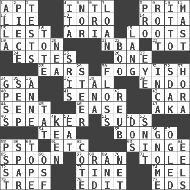 ACROSS 1. Fitting 4. International (abbr.) 8. Demure 12. Falsehood 13. "Corrida" creature 14. Round or rotation of duties 15. For fear that 17. Roberta Peters solo 18. Plunders 19. NE Massachussets city 21. Basketball assoc. 23. Small child 24. _____ Park, CO 26. Single 28. Hearing organs 30. Out of fashion; old fashioned 34. Girls' org. (abbr.) 37. Slanted text style (abbr.) 39. Inside; within (prefix) 40. Fenced enclosure 41. Sir (Sp.) 43. Automobile 44. Posted 46. Relaxation 47. Alias (abbr.) 48. Orator 51. Beer foam 54. Afternoon social gathering 55. Beat drum 58. Pacific Standard Time (abbr.) 61. And so on (abbr.) 63. Scorch 65. Soup utensil 67. NW Algerian seaport 71. Lacquered or enameled metalware 72. Plant excrements 73. Prong on a fork 74. Cartoonist voice _ Blanc 75. Not kosher 76. Prepare for publication 77. Begley and Asner DOWN 1. Silent film actress Nazimova 2. Component 3. Trials 4. Call ___ day 5. Not either 6. Three (prefix) 7. Grant temporary use of 8. Adept person 9. Carrot, for example 10. "Tell ____ the Marines!" 11. Vertical spar for supporting sails 16. Carry 18. Austrian-born American filmmaker Fritz 20. Teachers' org. 22. Oct. 31 cry 25. Indian titles of respect 27. Sight organ 29. Guide 30. Soft thread for cleaning between teeth 31. South American Indian 32. Neighbor of Neb. 33. Israeli folk dance 34. Global Positioning Systems (abbr.) 35. Ooze 36. Queen of England 1702-14 38. Santa ___, CA 42. Reuben's nickname 45. Make lace 49. Peachy ____! 50. Erode 52. Two (Sp.) 53. In a ____ (agitated or irritated) 56. Dwarf 57. Stared 58. Inconspicuous attention getter 59. Practice fight 60. Drink excessively 62. ____ d'Azur (French Riviera) 64. Snakelike fish 66. Order of Saint Francis (abbr.) 68. To free from 69. Black tropical American cuckoo 70. Fish or hair follower