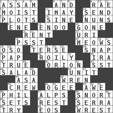 ACROSS 1. Indian state 6. Also 9. Actress Charlotte 12. Damp 13. "If ____ say so..." 14. Post 15. Ground plans 16. Trig term 17. Religious women 18. Compass dir. 19. Inside; within (prefix) 20. Went 21. Monthly bill 23. RI univ. 24. Inconspicuous attention getter 25. Catcalls? 28. Bear (Spanish) 30. Laconic 34. Fastener 35. Infant food 36. Turbulent 38. Retirement account (abbr.) 39. Loyal 41. Constellation of myth 43. Fast jet (abbr.) 44. First course 46. A single undivided whole 48. White ___ sheet 49. Songbird 50. Group working together 51. Double curve, resembling the letter S 53. Deep reverence 56. Silvers or Donahue 57. High mountains 58. Derisive sound 60. Puts into a specified state 61. Relief 62. Spanish missionary in California 63. Attempt 64. Greek goddess of the dawn 65. Take or capture by force DOWN 1. Electrical Unit 2. Flatfish 3. The Jewish people; Israel 4. Michaelmas daisies 5. Mountains (abbr.) 6. Among 7. Billionth: prefix 8. Color 9. One who advocates reunion 10. Singer Murray 11. Begley and Asner 13. Is not 14. Sounds asleep 19. Keyboard key 20. Chewing product 22. Eastern Standard Time (abbr.) 24. Teen's desire 26. Armed conflicts 27. Petty quarrel 28. Chooses 29. "Two Mules for Sister ____" 31. Friend of Pooh 32. Title for a knight 33. Connecticut Ivy Leaguer 37. You are 40. Artist's stands 42. Compass dir. 45. Fool 47. Sillier 49. Compass direction 50. "Mermaids" star 51. Margarine 52. Global Positioning Systems (abbr.) 54. Had on 55. Blunders 56. Pacific Standard Time (abbr.) 57. "We ___ not amused" (Victoria) 58. Compass dir. 59. Make lace