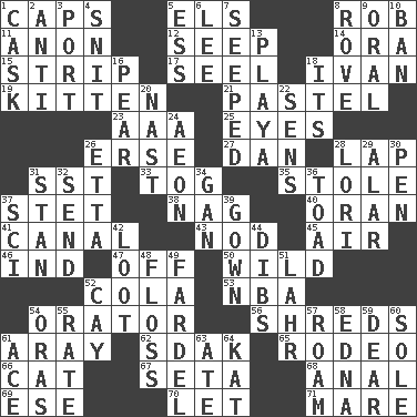 ACROSS 1. Smile enhancers 5. Raised railways 8. Director Reiner 11. At once, immediately (arch.) 12. Ooze 14. Mouth or opening 15. Empty completely 17. Stitch closed the eyes of (a falcon) 18. _ the terrible 19. Baby cat 21. Soft color 23. American Automobile Association (abbr.) 25. Sight organs 26. Celtic language 27. One of the 12 tribes of Israel 28. Infant locale 31. Fast jet (abbr.) 33. Coat; cloak 35. Took without asking 37. Proofreading order 38. Tired old horse 40. NW Algerian seaport 41. Lessep's creation 43. Allow head to fall sleepily 45. Atmosphere 46. Indiana (abbr.) 47. Not in operation 50. Rampant 52. Root beer relative 53. Basketball assoc. 54. Speaker 56. Tears up 61. Like ___ of sunshine 62. Neighbor of Neb. 65. Cowboy competition 66. Domesticated feline 67. Stalk of a moss capsule 68. Of or related to the anus 69. Compass dir. 70. Allow 71. Female horse DOWN 1. Keg 2. Opposed to 3. Sweet dark-red dessert wine 4. In a ____ (agitated or irritated) 5. Double-curved letter 6. Area sheltered from the wind 7. Oozed 8. Be footloose 9. Taken by mouth 10. Forbid 13. Beach, in Buenos Aires 16. Lightbulb-shaped fruit 18. It is 20. Political cartoonist Thomas 22. Elected reps. 24. A really long time 26. Singer James 28. Australian parrot (variant) 29. Having or resembling wings 30. Fenced enclosure 31. Comedian Laurel of Laurel & Hardy 32. Transmit 34. Separate the seeds from cotton 36. Frog relative 37. _-fi 39. Bride's dress 42. Plunder 44. Rights 48. Soft thread for cleaning between teeth 49. Pack 51. Cowardly lion portrayer 52. Island 54. Mouths or openings 55. Assign a rank or rating to 57. Wander aimlessly 58. Pulitzer Prize-winning author Ferber 59. Letter starter 60. Flatfish 61. Adept person 63. Had dinner 64. Krazy ___ of comics