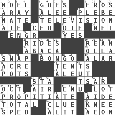 ACROSS 1. Christmas carol 5. Moves 9. Greek god of love 13. Like ___ of sunshine 14. Toward shelter 15. Cadet 16. Nathan's nickname 17. Boob tube 19. Had dinner 20. Corporate head (abbr.) 21. Expire 22. Remaining after all deductions 23. Engineer (abbr.) 25. Consenting reply 26. Amusement-park features 30. 480, 500 or 516 sheets of paper 34. Phillipine bananalike plant 35. Water jar 36. Fastener 39. Beat drum 42. Having or resembling wings 43. 1/640 square mile 44. Portable shelters 46. Plant holders 47. Eskimo relative 48. R.R. building 51. Russian ruler of old 54. Sep. follower 57. Wind 58. Australian flightless bird 60. Car dealer's back yard 62. Conciliate 65. Helper 66. "_____ Recall" 67. A slight indication 68. Leg joint 69. Hurried 70. Came down and settled, as after flight 71. Period of immesurable duration DOWN 1. Nanny 2. Speak pompously 3. Eroded 4. Sodium hydroxide 5. Yard entry 6. Butter sub 7. Snakelike fish 8. Sleazy 9. Raised railways 10. It's straight from the horse's mouth 11. Mitch Miller's instrument 12. Transmitted 15. Sliced desserts 18. Compete 20. Baby bed with high sides 24. Raisin fruits 27. Pat or tap gently 28. Environmental prefix 29. Before Barbara or Clara 30. Exposes to great heat 31. Pipe bend 32. Wing 33. Spoil 36. Plant excrement 37. Non-commissioned officer (abbr.) 38. Nonscientific branch of learning 40. Set 41. Single 45. Ballerina skirt 48. Travel by water 49. Teat (slang) 50. N. Chile seaport 52. Place in a line 53. Cowboy competition 54. Elects 55. Riding implement 56. Haul 58. Needle case 59. Rendezvous 61. Adolescent 63. Writing tablet 64. Everything 65. Alias (abbr.)