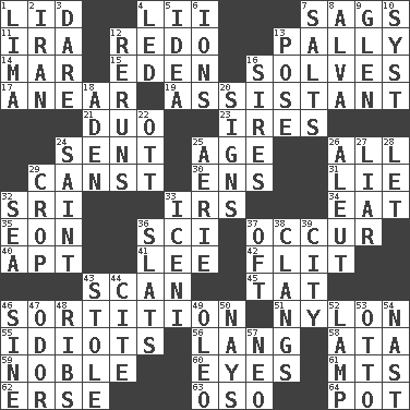 ACROSS 1. Flaplike covering 4. Cards in a Roman deck? 7. Settles 11. Retirement account (abbr.) 12. Do over again 13. Chummy 14. Make imperfect 15. Genesis locale 16. Finds the solution 17. Approach 19. Helper 21. Superhero pair 23. Angers 24. Emitted 25. Mature 26. 100% 29. 2nd pers. sing. pres. of can (arch.) 30. Followers of ems 31. Falsehood 32. _ Lanka 33. Big collection agency 34. Ingest 35. Period of immesurable duration 36. _-fi 37. Come to pass 40. Fitting 41. Area sheltered from the wind 42. Secret move to avoid paying debts 43. Examine hastily 45. Make lace 46. Conclusion 51. High-strength synthetic material 55. Foolish or stupid persons 56. Long (Scottish) 58. "One Day ___ Time" 59. Impressive in appearance 60. Sight organs 61. Mountains (abbr.) 62. Celtic language 63. Bear (Spanish) 64. Plant holder DOWN 1. Pale green bean 2. SW Asia republic 3. Have the gumption 4. Directed 5. The content of cognition 6. Charged particles 7. Table seasonings 8. Inventor's middle name 9. Small, secluded valley 10. System (abbr.) 12. Summer TV shows 13. Introduce or present, as a question 16. Founders of families 18. An important port of Yemen 20. Omens 22. Baseball player Mel 24. Virtuous person 25. Nest on high 26. Eskimo relative 27. One who doesn't tell the truth 28. Allow 29. Riding implement 32. Ocean 33. Ancient Celtic tribe of eastern Britain 36. Narrow boards 37. Often (poetically) 38. Rings loudly 39. Municipality 43. Fur scarf 44. Quote 46. Trig term 47. Scent 48. Chest bones 49. Butter sub 50. Negative votes 52. Desk light 53. "Beetle Bailey" pooch 54. Political cartoonist Thomas 57. Modern: prefix