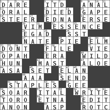 ACROSS 1. Have the gumption 5. It would 8. Of or related to the anus 12. Of the mouth 13. Passed on 15. Stare wonderingly 16. Bull 18. Pulitzer Prize-winning author Ferber 19. Celtic language 20. Zeal 22. Gist 24. Mild oath 26. Fast jet (abbr.) 27. Nathan's nickname 28. Sliced dessert 29. Shade tree 32. Do not 35. Do some clerical work 37. Compete 38. Brightly colored fish 39. Epoch 40. Rampant 41. Attila the _ 42. Vertical spar for supporting sails 43. _ vera 44. White ___ sheet 45. Arrange properly for use 46. Liveliness 49. Auto club (abbr.) 50. Transmit 51. Paper fasteners 55. Unit of force equal to gravity 56. Fly high 57. Slanted text style (abbr.) 59. Compose 63. "Corrida" creature 64. Inactive volcano in Sicily 65. Prepare for publication 66. Soon (poet.) 67. Viper 68. College mil. group DOWN 1. Two (Sp.) 2. Tate display 3. Actress Charlotte 4. Veterans Day date 5. Binary compound 6. Event that recurs at intervals 7. Cub Scout units 8. Rep 9. Drug cop 10. Domed church section 11. Area sheltered from the wind 14. Hyrax 17. Capital of Latvia 21. Floor covering 23. Compass dir. 25. Outscore 28. Food holders 29. Morally bad or wrong 30. _ and Stitch 31. Ancient Persian 32. Capital of the state of Qatar 33. Musical composition 34. Grandmother 36. Big collection agency 40. Nomad 42. Ear of corn 45. Plant excrement 47. Part of a journey 48. Afresh 49. Composer Copland 51. Within a short period 52. Pacific island yam 53. Singer James 54. Without 56. R.R. building 58. Infant locale 60. Wedding promise 61. Teat (slang) 62. And so on (abbr.)
