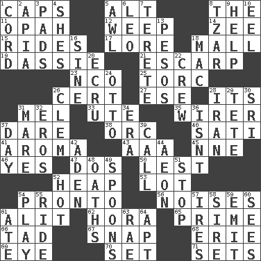 ACROSS 1. Smile enhancers 5. The first octave above the treble staff 8. Definite Article 11. Brightly colored fish 12. Shed a tear 14. Last letter of the English alphabet 15. Amusement-park features 17. Old wives' tales, e.g. 18. Shopping center 19. Hyrax 21. Fortification 23. Non-commissioned officer (abbr.) 25. Torque (variant) 26. Foregone conclusion 27. Compass dir. 28. It is 31. Cartoonist voice _ Blanc 33. Shoshoni 35. One who wires 37. Have the gumption 38. The grampus (Milton) 40. Suttee (variant) 41. Odor 43. Auto club (abbr.) 45. Compass dir. 46. Consenting reply 47. Two (Sp.) 50. For fear that 52. Pile 53. Car dealer's back yard 54. Right away 56. Annoying sounds 61. Set down 62. Israeli folk dance 65. A-one 66. Bit 67. Fastener 68. 4th largest of the Great Lakes 69. Sight organ 70. Put into a specified state 71. Arranges properly for use DOWN 1. Drawstring 2. Capital of Western Samoa 3. Groovy apts. 4. "______ My Girl" (Turtles hit) 5. Leather borer 6. Lion 7. Cylindrical with tapered ends 8. Russian ruler 9. Assist 10. Snakelike fish 13. Mexican monetary units 16. Trig term 18. Big _ 20. Shade of tan 22. Group working together 24. "Beetle Bailey" pooch 26. Clement's nick name 28. SW Asia republic 29. False hair 30. _ Lanka 31. Female horse 32. Greek god of love 34. Period 36. Is not 37. 24 hours 39. Give a ring to 42. Arabian gulf 44. A really long time 48. Curses 49. Soup utensils 51. Cease 52. Being at a high temperature 54. Frolic 55. Travel on or in a vehicle 57. Angers 58. Male parent of an animal 59. Send forth 60. Observes 61. Had dinner 63. Actress Charlotte 64. Fitting