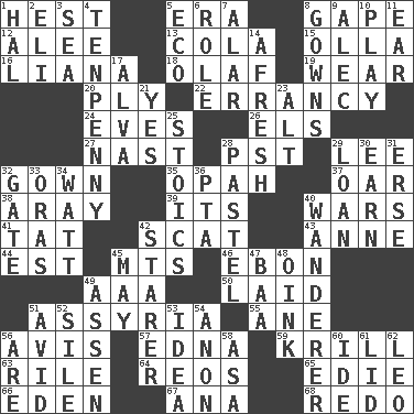ACROSS 1. Command 5. Period 8. Stare wonderingly 12. Toward shelter 13. Root beer relative 15. Rounded earthenware pot or jar 16. Climbing, woody, usually tropical vines 18. Norwegian king 19. Put on (as clothing) 20. Travel a route regularly 22. Tendancy to err 24. Nights before holidays 26. Raised railways 27. Political cartoonist Thomas 28. Pacific Standard Time (abbr.) 29. Area sheltered from the wind 32. Long dress 35. Brightly colored fish 37. Rowing implement 38. Like ___ of sunshine 39. It is 40. Armed conflicts 41. Make lace 42. Leave at once 43. Queen of England 1702-14 44. Eastern Standard Time (abbr.) 45. Mountains (abbr.) 46. Inky black, to poets 49. American Automobile Association (abbr.) 50. Put down 51. Nineveh was its capital 55. A saturated hydrocarbon 56. Advice 57. Pulitzer Prize-winning author Ferber 59. The principal food of baleen whales 63. Cause heat under the collar 64. Vintage cars 65. Singer Brickell 66. Paradise 67. Santa ___, CA 68. Make new DOWN 1. Actor Linden 2. Biblical high priest 3. Ocean 4. 3-inch nail 5. Environmental prefix 6. Hero or heavy, e.g. 7. Having or resembling wings 8. Women's formal wear 9. Actor Baldwin 10. Shaw product 11. Ewer handle 14. Anew 17. Inventor's middle name 21. Consenting reply 23. Keyboard modifier key 25. Unemotional ones 28. Soft color 29. Grant temporary use of 30. Merit 31. Celtic language 32. Yard entry 33. Mouths or openings 34. Electrical Unit 36. Parent Teacher Association (abbr.) 40. Nomad 42. A viewer who gazes fixedly 45. Can I? 47. Sound made by sheep 48. Pig sound 49. NE Netherlands city 51. Enthusiastic 52. Filth; sediment 53. The main thing one is thinking about 54. At once, immediately (arch.) 56. "We ___ not amused" (Victoria) 58. White ___ sheet 60. Binary compound 61. Hat (slang) 62. Lion