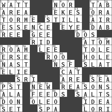 ACROSS 1. Electrical Unit 5. Not either 8. Bar bill 11. Length times width 12. Supplements with great effort 14. Mouth or opening 15. Singer Mel 17. Free of sound 18. Wind 19. Substance 21. Sight organ 22. Small moist lump or mass 23. To riddle 24. Unit of force equal to gravity 25. Two (Sp.) 27. To free from 28. Tiny particle 31. Wander aimlessly 35. Area sheltered from the wind 37. Lacquered or enameled metalware 38. Celtic language 39. Friend of Pooh 41. Hollow 42. Political cartoonist Thomas 43. Overdraft (abbr.) 45. Narrow board 46. Writer Wiesel 47. Feline 49. _ Lanka 51. "We ___ not amused" (Victoria) 52. Ocean 55. Pacific Standard Time (abbr.) 57. ___ Haven, CT 60. Thinks logically 62. Insect wing 63. Eats 65. Table seasonings 66. Spanish title 67. Butter sub 68. It may be bright or harebrained 69. Put into a specified state 70. Health resort 71. Australian parrot (variant) DOWN 1. Wetness 2. Came up 3. Laconic 4. Not wild 5. Fish or hair follower 6. Migrant worker of the '30s 7. Have trust in 8. Inedible or poisonous agaric 9. Operatic vocal solo 10. Sharp remark 13. Downhill vehicle 16. Engineer (abbr.) 17. Sowing specialist 20. To provide with a ceiling 26. Expletives 29. Water jar 30. Rendezvous 31. French philosopher Descartes 32. Taken by mouth 33. Aide 34. Distance measurement 36. Period of immesurable duration 40. Motion picture awards 44. Conductor's collection 48. Beverages made from leaves 50. Information 52. Twentieth part of a lira 53. Keyboard key 54. Slender Brazilian palm 55. Writing tablets 56. _ gin 58. Snakelike fish 59. Shed a tear 61. Move on water 64. ___ good deed