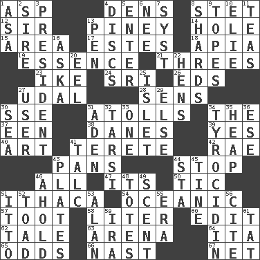 ACROSS 1. Cleo's killer 4. Hiding places for outlaws 8. Proofreading order 12. Title for a knight 13. Abounding in pines 14. Opening into or through something 15. Type of rug 17. _____ Park, CO 18. Capital of Western Samoa 19. Core 21. Threesomes 23. Mamie's mate 24. Indian title of respect (Mr.) 26. Begley and Asner 27. Freehold land 28. Elected reps. 30. Compass dir. 31. Ringlike coral islands and reefs 34. Definite Article 37. Car or cant ending 38. Natives or inhabitants of Denmark 39. Affirmative reply 40. Nonscientific branch of learning 41. Cigar-shaped 42. Actress Charlotte 43. Zero-star reviews 44. Obstruct or block passage 46. Everything 47. It is 50. Nervous spasm 51. New York city 54. Pertaining to the sea 57. A blast of a horn 58. 61 cubic inches 60. Prepare for publication 62. Lie 63. Sports stadium 64. Call ___ day 65. Probability 66. Political cartoonist Thomas 67. Fish or hair follower DOWN 1. White ___ sheet 2. Father 3. Elected leader of a country 4. Plates 5. Keyboard key 6. Born 7. System (abbr.) 8. Pottery fragments 9. Drinks excessively 10. Writer Wiesel 11. Beverages made from leaves 13. Fenced enclosure 16. "____ silly question..." 20. Snakelike fish 22. Coop moms 25. Small island 27. One who uses or employs something 29. Otherwise 30. Ocean 31. Arabian gulf 32. Tarsus (plural) 33. Single 34. Polypeptide antibiotic 35. Pile 36. Compass dir. 41. Baby powder 43. Food holders 44. R.R. building 45. Prong on a fork 46. Hold, grip (Informal) 48. Lugs 49. Odor 51. "Tell ____ the Marines!" 52. Frog relative 53. Actor Alda or Thicke 55. Period 56. Quote 59. Lyricist Gershwin 61. Make lace