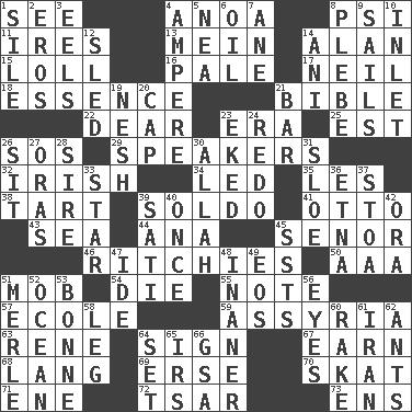 ACROSS 1. Observe 4. Small Philippine buffalo 8. 23rd letter of the Greek alphabet 11. Angers 13. Count _ (2 wds.) 14. Actor Alda or Thicke 15. Hang loosely or laxly 16. Diluted with white 17. Famous astronaut Armstrong 18. Gist 21. God's Word 22. Letter starter 23. Period 25. Eastern Standard Time (abbr.) 26. Mayday 29. Orators 32. From or relating to Ireland 34. Directed 35. French article 38. Small pie 39. Twentieth part of a lira 41. Von Bismarck 43. Ocean 44. Santa ___, CA 45. Sir (Sp.) 46. Actors Guy, Robert Welles, and Clint 50. American Automobile Association (abbr.) 51. Disorderly crowd 54. Expire 55. Make mention of 57. Learning spot: Fr. 59. Nineveh was its capital 63. French philosopher Descartes 64. Signal 67. Merit 68. Long (Scottish) 69. Celtic language 70. Three-handed card game 71. Compass dir. 72. Russian ruler of old 73. Followers of ems DOWN 1. Drop; flow; fall 2. Greek god of love 3. Snakelike fish 4. Electrical Unit 5. Teachers' org. 6. Lubricate 7. One (Scot) 8. Cadet 9. Moves on water 10. An arm off of a larger body of water 12. Downhill vehicle 14. Cuckoo 19. Delicate 20. Head covering 21. Soap unit 23. Supplemented with great effort 24. Redecorate 26. Be seated 27. Mouths or openings 28. Title for a man of rank and authority 30. Assad's deity 31. A type of plum 33. Play the lead 36. Inactive volcano in Sicily 37. Portico 39. Suttee (variant) 40. At one time in the past 42. Mouth or opening 45. Fast planes 47. Binary compound 48. Sillier 49. Greek goddess of the dawn 51. Haggard of country music 52. Sea 53. Maid-servant 56. Snake ____ (dice throw) 58. Part of a journey 60. Immoral or dissolute person 61. SW Asia republic 62. Pismires 64. Put into a specified state 65. Big collection agency 66. Girls' org. (abbr.)