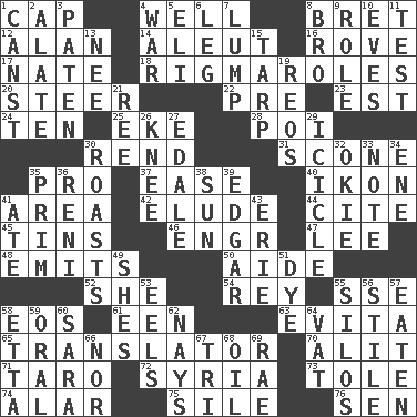 ACROSS 1. Head covering 4. Water source 8. Cy Young winner Saberhagen 12. Actor Alda or Thicke 14. Native American of Southwest Alaska 16. Be footloose 17. Nathan's nickname 18. Complicated, petty procedures 20. Guide 22. Before (prefix) 23. Eastern Standard Time (abbr.) 24. Nine, plus one 25. Supplement with great effort 28. Luau course 30. Tear apart 31. Biscuitlike quick bread 35. Adept person 37. Relaxation 40. Visual representation of an object 41. Type of rug 42. Evade 44. Quote 45. Canisters 46. Engineer (abbr.) 47. Area sheltered from the wind 48. Sends forth 50. Helper 52. A female animal or person 54. Marina Del _, California 55. Compass dir. 58. Greek goddess of the dawn 61. Car or cant ending 63. Webber/Rice musical 65. Interpreter 70. Set down 71. Edible starchy tuberous root 72. Damascus' land 73. Lacquered or enameled metalware 74. Having or resembling wings 75. Drop; flow; fall 76. Elected rep. DOWN 1. 2nd pers. sing. pres. of can (arch.) 2. Having winglike extensions 3. Eucharist need 4. Armed conflict 5. Connecticut Ivy Leaguer 6. Part of a journey 7. Mass 8. Sis' sibling 9. Hero or heavy, e.g. 10. Nights before holidays 11. Trial 13. Born 15. Canvas cover 19. Vintage cars 21. To riddle 26. Leg joint 27. Peak District village in England 29. Hanging ice 30. Cooks with dry heat, as in an oven 32. Migrant worker of the '30s 33. Brief written record 34. Compass dir. 35. Demure 36. Painter Guido (1575-1642) 38. Player for Phoenix 39. _ Allan Poe 41. Had dinner 43. 4th largest of the Great Lakes 49. "______ My Girl" (Turtles hit) 51. Color 53. Snakelike fish 55. Grain storage towers 56. Vertical member of a panel or frame 57. Ingested 58. Singer James 59. Taken by mouth 60. "Two Mules for Sister ____" 62. Negative votes 64. Large container 66. Not either 67. Three (prefix) 68. Lubricate 69. Actress Charlotte