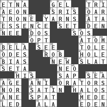 ACROSS 1. Inactive volcano in Sicily 5. Set 8. Three (prefix) 11. A really long time 12. Indian titles of respect 14. Rowing implement 15. Marketplace scale 17. Tall tales 18. "One Day ___ Time" 19. Core 21. Put into a specified state 22. Lair 23. Born 24. Two (Sp.) 25. Distress signal 27. Choose 28. Smallest unit of an element 31. Actor Lugosi 35. Perceive with the eye 37. Lacquered or enameled metalware 38. Lyric poems 39. Director Reiner 41. Opening into or through something 42. Prejudice 43. ___ Haven, CT 45. Narrow board 46. Bristle 47. Modern: prefix 49. Part of HMS, perhaps 51. Plant excrement 52. Ocean 55. Grow older 57. Black tropical American cuckoo 60. Speakers 62. Not either 63. Smooth fabric 65. Saint headwear 66. A saturated hydrocarbon 67. Argument over a trivial matter 68. Ancient Persian 69. Directed 70. In the manner of 71. Locale of original sin DOWN 1. Consumed 2. Laconic 3. Trap for birds or small mammals 4. Singer Murray 5. Girls' org. (abbr.) 6. Blunders 7. Actor's bit 8. Inedible or poisonous agaric 9. Assign a rank or rating to 10. SW Asia republic 13. Fast planes 16. Inside; within (prefix) 17. Of or pertaining to yesterday 20. 911 reaches them 26. Expletives 29. Water jar 30. Rendezvous 31. Moves up and down 32. Singer Brickell 33. Resembling or made to resemble leather 34. Slender Brazilian palm 36. A really long time 40. Gillaume's butler role 44. Put on (as clothing) 48. Brightly colored fish 50. Backtalk 52. Having a sole or soles 53. Wear away 54. NE Netherlands city 55. Of or related to the anus 56. Went 58. California wine valley 59. Slanted text style (abbr.) 61. Docile 64. Call ___ day