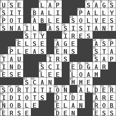 ACROSS 1. Purpose 4. Pet locale 7. Sinks 11. Be seated 12. Indonesian resort city 13. Chummy 14. Cooking vessel 15. Competent 16. Finds the solution 17. Slow-paced one 19. Helper 21. Filthy place 23. Angers 24. Otherwise 25. Personal question 26. Cleo's killer 29. Entreaties 30. Followers of ems 31. R.R. building 32. The 19th letter of the Greek alphabet 33. Big collection agency 34. Plant excrement 35. Indiana (abbr.) 36. _-fi 37. _ Allan Poe 40. Compass dir. 41. Area sheltered from the wind 42. Rich soil 43. Examine hastily 45. Madame (abbr.) 46. Determination 51. Tree or shrub in the Birch family 55. Foolish or stupid persons 56. "You Light Up My Life" star Conn 58. "We ___ not amused" (Victoria) 59. Having high moral qualities 60. Style 61. Director Reiner 62. Celtic language 63. Lair 64. Double-curved letter DOWN 1. United States Postal Service (abbr.) 2. The Jewish people; Israel 3. Singer James 4. Experiment locale 5. Silent film actress Nazimova 6. Sliced desserts 7. Table seasonings 8. Inventor's middle name 9. Small, secluded valley 10. System (abbr.) 12. Greek mezzo-soprano Agnes 13. Airs 16. Founders of families 18. Small island 20. Attaches a signature 22. Affirmative reply 24. Evade 25. Nest on high 26. Indian state 27. Play the lead 28. Infant food 29. Zero-star reviews 32. Standoff 33. Ancient Celtic tribe of eastern Britain 36. Narrow boards 37. Shade tree 38. Realm 39. Highlander 43. Took without asking 44. Quote 46. Trig term 47. Scent 48. Chest bones 49. Wrote a lyric poem 50. Mediterranean tributary 52. Have the gumption 53. Greek god of love 54. Confederate soldiers (slang) 57. One of the 12 tribes of Israel