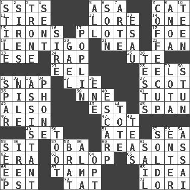ACROSS 1. Fast planes 5. White ___ sheet 8. Feline 11. Become fatigued 12. Old wives' tales, e.g. 14. Single 15. Metal shackles 17. Ground plans 18. Enemy 19. Small, flat, pigmented spot on the skin 21. Teachers' org. 22. Air blower 23. Compass dir. 24. Reproach for some lapse or misdeed 25. Shoshoni 27. Snakelike fish 28. Snakelike fish 31. Fastener 35. Untruth 37. Highlander 38. Expression of disdain 39. Compass dir. 41. Ballerina skirt 42. In addition 43. Eastern Standard Time (abbr.) 45. Connect, as a bridge 46. It's straight from the horse's mouth 47. Small bed 49. Put into a specified state 51. Had dinner 52. Ocean 55. Be seated 57. Chief or king in Benin or Nigeria 60. Thinks logically 62. Period 63. Fourth or lowest deck 65. Table seasonings 66. Car or cant ending 67. Pack (down) 68. The main thing one is thinking about 69. Pacific Standard Time (abbr.) 70. Make lace 71. Australian parrot (variant) DOWN 1. Vertical member of a panel or frame 2. Fathers 3. Marketplace scale 4. Posted 5. Everything 6. Within a short period 7. Johnson of "Laugh-In" 8. Java holder (2 wds.) 9. Small Philippine buffalo 10. Adolescent 13. He sold his birthright 16. Father 17. Cotton for raincoats, e.g. 20. Highlander 26. Trials 29. Globular water bottle used in Asia 30. Surprise greatly 31. Practice fight 32. "Death on the ____" 33. Aide 34. Give a jingle 36. Compass dir. 40. Fortification 44. Carryall 48. Afternoon social gatherings 50. A blast of a horn 52. Twentieth part of a lira 53. Keyboard key 54. Slender Brazilian palm 55. Ooze 56. Angers 58. Naughty child 59. _ mater 61. Travel by water 64. Choose