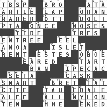 ACROSS 1. Cook's measure (abbr.) 5. Sis' sibling 8. "One Day ___ Time" 11. Nick name for Arthur 13. Infant locale 14. NW Algerian seaport 15. More valued for its uncommonness 16. Baseball player Mel 17. Stupid person 18. Parent Teacher Association (abbr.) 19. Single time 21. Olfactory organs 22. Periodic rise and fall of the sea level 24. Angers 25. Main course 27. Snakelike fish 29. Small Philippine buffalo 30. Small island 32. Monthly bill 33. _____ Park, CO 35. Mitch Miller's instrument 39. Having ears or earlike features 41. Small pie 42. Bar 43. Medicinal drug used to evoke vomiting 45. Bristle 48. Keg 49. Don Adams' spy role 50. Cy Young winner Saberhagen 52. Make lace 55. Quote 56. The 19th letter of the Greek alphabet 57. Peak District village in England 59. Toward shelter 60. Everything 61. High-strength synthetic material 62. Nine, plus one 63. Madame (abbr.) 64. Supplemented with great effort DOWN 1. Canvas cover 2. Naughty child 3. Ski resort town in Vermont 4. Sliced dessert 5. Coalition 6. Assign a rank or rating to 7. Choose 8. Came up 9. Stories 10. Pismires 12. Eat (away) 14. Scent 20. Born 21. Mediterranean tributary 23. Feeling or showing extreme anger 25. Ewer handle 26. Compass dir. 27. Compass dir. 28. Raised railways 30. It would 31. Hauls 33. Period 34. Elected rep. 36. Sass 37. Mouth or opening 38. And so on (abbr.) 40. Blind as ____ 43. Frozen water 44. Eucharist need 45. Grin 46. Consumed 47. Relationship diagram 49. Get outta here! 50. Lip ointment 51. Governing power 53. _ vera 54. Be inclined (to) 56. Scottish cap 58. Color