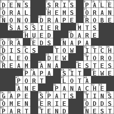 ACROSS 1. Habitations of wild animals 5. Indian titles of respect 9. Diluted with white 13. Spoken 14. Folds over and sews together 15. Northwest Algerian city 16. Words to Nanette 17. Window treatment 18. Loose flowing garment 19. More impudent 21. Mountains (abbr.) 22. Took on color 23. Have the gumption 24. Mouth or opening 27. Begley and Asner 28. California wine valley 29. Plates 31. Pull behind 32. Hankering 36. Margarine 37. Morning condensation 38. "Corrida" creature 39. 480, 500 or 516 sheets of paper 40. Santa ___, CA 41. _____ Park, CO 42. Dad 44. Be seated 46. She-sheep 47. Sweet dark-red dessert wine 48. Globular water bottle used in Asia 50. A saturated hydrocarbon 51. Flamboyance 54. Yawn 56. Arguments over trivial matters 58. Metal containers 60. Sign of something about to happen 61. One of the Great Lakes 62. Probability 63. Role in a play 64. Be inclined (to) 65. Egg locale DOWN 1. Spanish title 2. Greek god of love 3. Grandmother 4. Make a splashing sound 5. Fragments 6. Bring up, as a child 7. Naughty child 8. Compass dir. 9. Likenesses of persons 10. Came up 11. Experiment locale 12. Compass dir. 17. Passed on 20. Takes to court 21. Atlas unit 23. Fool 24. Aroma 25. Cause heat under the collar 26. At sea 28. Immediately 30. Part 31. Beverage made from leaves 33. Haul 34. Ship's personnel 35. Stockings 37. Heredity factor (abbr.) 40. Fitting 41. Singer James 43. "We ___ not amused" (Victoria) 44. Scheduled 45. Charged particles 47. Some stationery 49. NE Massachussets city 51. Ache 52. Flintstone garb 53. Extremities 54. Grand Old Party 55. Housemaid (var.) 56. Arrange properly for use 57. Before (prefix) 59. Fast jet (abbr.)