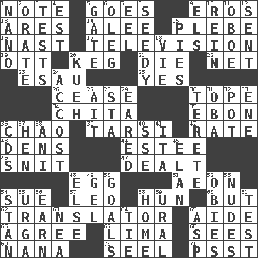 ACROSS 1. Observe 5. Moves 9. Greek god of love 13. Ancient Greek god of war 14. Toward shelter 15. First-year military academy student 16. Political cartoonist Thomas 17. Household entertainment appliance 19. Baseball player Mel 20. Barrel 21. Pass on 22. Fish or hair follower 23. He sold his birthright 25. Affirmative reply 26. Stop 30. Drink excessively 34. Riviera of "Kiss of the Spider Woman" 35. Inky black, to poets 36. US Secretary of Labor Elaine L. _ 39. Tarsus (plural) 42. Assign a rank or rating to 43. Habitations of wild animals 44. First name in cosmetics 46. In a ____ (agitated or irritated) 47. Started a card game 48. Ovum 51. A really long time 54. Take to court 57. Lion 58. Attila the _ 60. With the exception that 62. Interpreter 65. Helper 66. Match 67. Pale green bean 68. Observes 69. Nanny 70. Sew up the eyelids of hawks and falcons 71. Inconspicuous attention getter DOWN 1. Billionth: prefix 2. Speak pompously 3. Trials 4. Eastern Standard Time (abbr.) 5. Yard entry 6. Cassini of fashion 7. Snakelike fish 8. Shabby and untidy 9. Raised railways 10. It's straight from the horse's mouth 11. Mitch Miller's instrument 12. Posted 15. Sliced desserts 18. Compete 20. Malaysian steamed pastry 24. Buttonhole 27. Small island 28. R.R. building 29. Having ears or earlike features 30. Cylindrical with tapered ends 31. Chief or king in Benin or Nigeria 32. Plant holder 33. Compass dir. 36. Music discs 37. Layer 38. Black tropical American cuckoo 40. Compass dir. 41. Call ___ day 45. Liveliness 48. Otherwise 49. Set 50. Finish lines 52. Off-Broadway awards 53. Unadorned figures 54. Comedian Laurel of Laurel & Hardy 55. Capital and largest city of Mongolia 56. Merit 58. Residence 59. Mountain range 61. Trial 63. Teachers' org. 64. Neckwear 65. Cleo's killer