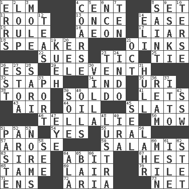 ACROSS 1. Shade tree 4. Penny 8. Arrange properly for use 11. Carrot, for example 13. At one time in the past 14. Relaxation 15. Court order 16. Period of immesurable duration 17. One who doesn't tell the truth 18. Orator 21. Pig sounds 22. Takes to court 23. Nervous spasm 25. Make a knot 26. Curvy letter 29. Veterans Day date 32. Staphylococcus 34. Working for oneself (abbr.) 35. RI univ. 38. "Corrida" creature 39. Twentieth part of a lira 41. Allows 43. Atmosphere 44. Lubricate 45. Narrow boards 46. Copy Pinocchio 50. Cut the grass 51. Baking dish 54. Affirmative reply 55. Mountain range 57. Came up 59. Deli grouping 63. Father 64. "This won't hurt ____!" 67. Command 68. Docile 69. Den 70. Cause heat under the collar 71. Followers of ems 72. Roberta Peters solo 73. Remaining after all deductions DOWN 1. Blunders 2. Central Nebraska county 3. Undercover agent 4. Unrefined 5. Compass dir. 6. Non-commissioned officer (abbr.) 7. "___ Little Indians" 8. Virtuous person 9. 1973 Nobel Price Winner (Physics) Leo 10. Laconic 12. Beverages made from leaves 14. Connecticut Ivy Leaguer 19. Malaysian steamed pastry 20. Snakelike fish 21. Sep. follower 23. Watch over 24. _ china 26. Eastern Standard Time (abbr.) 27. Portico 28. Indian skirt 30. Country residence 31. Frame or body of a ship 33. Sweet dark-red dessert wine 36. 480, 500 or 516 sheets of paper 37. "Tell ____ the Marines!" 39. Not divided or shared with others 40. Petroleums 42. Compass dir. 45. Lick closed 47. Sight organ 48. A period of five years 49. Lyricist Gershwin 51. Thick mixture 52. Believer in; advocate of (suffix) 53. Typical standards 56. Cowardly lion portrayer 58. Perceive with the eye 60. Chow _ 61. Capri or Wight 62. Proofreading order 64. Insect wing 65. Drinking establishment 66. One more than two
