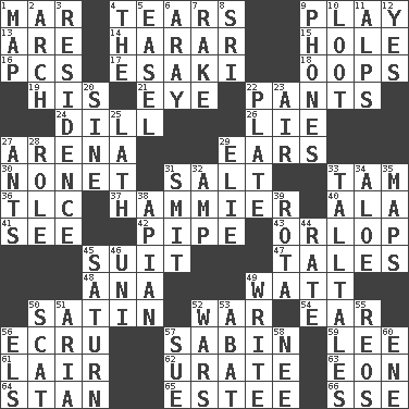 ACROSS 1. Third mo. 4. Pulls apart 9. Romp 13. "We ___ not amused" (Victoria) 14. Ethiopian city, capital of Harari 15. Hollow 16. Personal Computers (abbr.) 17. 1973 Nobel Price Winner (Physics) Leo 18. I made a mistake 19. Part of HMS, perhaps 21. Sight organ 22. Leg coverings 24. Deli pickle 26. Whopper 27. Sports stadium 29. Hearing organs 30. Music written for nine 31. Table seasoning 33. Scottish cap 36. Affectionate concern, for short 37. More overdramatic by comparison 40. According to 41. Perceive with the eye 42. Corncob 43. Fourth or lowest deck 45. Set of matching outer garments 47. Stories 48. Santa ___, CA 49. Electrical Unit 50. Smooth fabric 52. Armed conflict 54. Ewer handle 56. Shade of tan 57. Unit of acoustic absorption 59. Area sheltered from the wind 61. Den 62. A salt of uric acid 63. Period of immesurable duration 64. Comedian Laurel of Laurel & Hardy 65. First name in cosmetics 66. Compass dir. DOWN 1. Atlas unit 2. Bowlike part 3. Dwelling 4. Definite Article 5. Artist's stand 6. Like ___ of sunshine 7. Libertine 8. Indian title of respect (Mr.) 9. Gives a jingle 10. Spoils 11. High mountains 12. It is so 20. Trig term 22. Food holder 23. Wind 25. Thin strip of wood or metal 27. Pismires 28. Hero or heavy, e.g. 29. Writer Wiesel 31. Stricken, poetically 32. Electrical Unit 33. Baron Munchausen's specialties 34. Medicinal plant 35. Atlas contents 38. Bee-related 39. Roll call or roster of names 44. Pace 45. Titan orbits this 46. University (slang) 49. Compose 50. Leave at once 51. Roberta Peters solo 52. Armed conflicts 53. Blind as ____ 55. Vintage cars 56. Raised railways 57. Institute legal proceedings 58. Born 60. Compass dir.