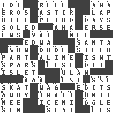 ACROSS 1. Small child 4. Coral collection 8. Santa ___, CA 11. Greek god of love 13. Moving about 15. Pet locale 16. Cause heat under the collar 17. Stone: prefix 18. 24-hour periods 19. Having a sole or soles 21. Housemaid (var.) 22. Celtic language 23. Followers of ems 24. Large container 27. Cartoonist voice _ Blanc 29. Pulitzer Prize-winning author Ferber 30. Before Barbara or Clara 34. Manchild 36. Mitch Miller's instrument 39. Guide 40. Piece 41. Place in a line 43. Is not 44. Practice fights 46. Otherwise 47. Baseball player Mel 48. Small island 49. ____ Bator 51. Auto club (abbr.) 53. Eastern Standard Time (abbr.) 54. Compass dir. 57. Three-handed card game 60. Tired old horse 63. Proofreads 65. Actor Griffith 66. Distinguishing feature 69. A single undivided whole 70. Born 71. Ancient Celtic tribe of eastern Britain 72. Stare 73. Elected rep. 74. Narrow board 75. Raised railways DOWN 1. Laconic 2. Constellation of myth 3. For Whom the Bell _____ 4. Reproach for some lapse or misdeed 5. Compass dir. 6. Singer James 7. Not soft or yielding to pressure 8. Having or resembling wings 9. Negative votes 10. Domed church section 12. Perceive with the eye 14. Wander aimlessly 18. Conveyance 20. Movie disc 25. Small Philippine buffalo 26. Eating place 28. Curvy letter 29. Plea 31. A home for chicks 32. Portable shelter 33. Nonscientific branch of learning 34. Plant excrements 35. Taken by mouth 37. Petroleum 38. Take place subsequently 40. Air pressure measure (abbr.) 42. Snakelike fish 45. R.R. building 50. Had dinner 52. Opposed to 54. Scorch 55. Not moving 56. _____ Park, CO 57. Without 58. Leg joint 59. Arabian gulf 61. Arches 62. Highlander 64. Superhero pair 67. _ tizzy (2 wds.) 68. Teat (slang)
