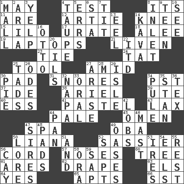 ACROSS 1. Fifth month 4. Trial 8. It is 11. "We ___ not amused" (Victoria) 12. Nick name for Arthur 14. Leg joint 15. _ and Stitch 17. A salt of uric acid 18. Toward shelter 19. Portable computers 21. Make or become more lively 23. Make a knot 24. Make lace 25. Instrument 27. Among 30. Groovy apt. 31. Sounds asleep 34. Pacific Standard Time (abbr.) 37. Binary compound 38. Satellite of Uranus 39. Shoshoni 40. Curvy letter 41. Soft color 43. Not strict 44. Light colored 45. Presage 47. Health resort 49. Chief or king in Benin or Nigeria 50. Woody, climbing, usually tropical plant 52. More lively and spirited 56. Drawstring 57. Olfactory organs 60. Relationship diagram 61. Ancient Greek god of war 62. Window treatment 63. Raised railways 64. It is so 65. Tenement units (abbr.) 66. Fast jet (abbr.) DOWN 1. Shopping center 2. Operatic vocal solo 3. Sharp bark 4. Grayish beige 5. Blunders 6. R.R. building 7. Teat (slang) 8. An arm off of a larger body of water 9. Adolescent 10. Observe 13. Snakelike fish 14. Polynesian shrub of the pepper family 16. Von Bismarck 20. Lubricates 22. It would 25. Small boys 26. Lyric poems 27. Ascend 28. Rendezvous 29. Capri or Wight 30. Sliced dessert 32. California wine valley 33. Spoken 34. Whine 35. Comedian Laurel of Laurel & Hardy 36. John Ritter's dad 42. Tennis shots 44. Baking dish 46. Vertical spar for supporting sails 47. Founders of families 48. Groovy apts. 49. Fertile tracts in a desert 50. Old wives' tales, e.g. 51. Added to 52. Back-to-school mo. 53. Angers 54. Snakelike fish 55. State of inaction 56. Island 58. Mouth or opening 59. Plant excrement
