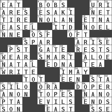 ACROSS 1. Erode 4. Moves up and down 8. RI univ. 11. Ancient Greek god of war 13. 1973 Nobel Price Winner (Physics) Leo 15. Fish or hair follower 16. Hoop that covers a wheel 17. Pitcher Ryan 18. Inactive volcano in Sicily 19. Artist's stand 21. It would 22. Christmas carol 23. Compass dir. 24. Order of Saint Francis (abbr.) 27. Often (poetically) 29. Practice fight 30. Ascend 34. Pacific Standard Time (abbr.) 36. Yard entry 39. Musical pauses 40. Put on (as clothing) 41. Don Adams' spy role 43. Medicinal plant 44. Brizilian seaport 46. Pulitzer Prize-winning author Ferber 47. Afternoon social gathering 48. Compose 49. "If ____ say so..." 51. Small child 53. Car or cant ending 54. R.R. building 57. Grain storage tower 60. Mouth or opening 63. Drug addict 65. Soon (poet.) 66. Drinks excessively 69. Billionth: prefix 70. Parent Teacher Association (abbr.) 71. Vices 72. Extremities 73. Boy, to dad 74. 90 degrees 75. Compass dir. DOWN 1. Ingested 2. Believer in; advocate of (suffix) 3. Laconic 4. Benjamin's nick name 5. Bear (Spanish) 6. Indonesian resort city 7. Three-handed card game 8. To (old English) 9. French philosopher Descartes 10. Slanted text style (abbr.) 12. Perceive with the eye 14. Southeast Asian peninsula 18. Plea 20. Trim (branches) 25. Settles 26. Movie unit 28. At a great distance 29. Ski resort town in Vermont 31. Capri or Wight 32. Portico 33. Compass dir. 34. Lightbulb-shaped fruit 35. Suttee (variant) 37. Small boy 38. Bert's buddy 40. Compass dir. 42. Docile 45. Lion 50. Added to 52. Carryall 54. Connects, as a bridge 55. Looks after 56. Came up 57. Plant excrements 58. To the inside or interior of 59. Grant temporary use of 61. Be footloose 62. Capital of Western Samoa 64. Single 67. Raised railways 68. Fast jet (abbr.)