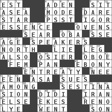 ACROSS 1. Eastern Standard Time (abbr.) 4. Arabian gulf 8. Be seated 11. At sea 13. Method 14. Have the gumption 15. Play the lead 16. Inconspicuous attention getter 17. Composer Stravinsky 18. Gist 21. Baking chambers 22. Burn superficially 23. Chief or king in Benin or Nigeria 25. Compass dir. 26. Personal question 29. Orators 32. 0 degrees 34. Untruth 35. Part of a journey 38. In addition 39. Flexible twig of a willow tree 41. Mitch Miller's instrument 43. Opposite of masc. 44. Baking dish 45. Black 46. Plea 50. Born 51. Car or cant ending 54. White ___ sheet 55. Takes to court 57. Amid 59. French poetic form 63. The Jewish people; Israel 64. "You Light Up My Life" star Conn 67. SW Asia republic 68. Otherwise 69. Supplements with great effort 70. Western Nevada city 71. Sodium hydroxide 72. Left 73. Boy, to dad DOWN 1. Relaxation 2. Fast planes 3. Beverages made from leaves 4. Electrical Unit 5. Two (Sp.) 6. Begley and Asner 7. Fish or hair follower 8. Gurus 9. Metal shackles 10. Laconic 12. Ancient Greek god of war 14. HTML Container Element 19. Soft 20. Head covering 21. Boat paddle 23. Migrant worker of the '30s 24. Fermented drink made from hops 26. Santa ___, CA 27. Eighteen holes 28. Celtic language 30. Place in a line 31. Messy guy 33. Heavy book 36. Inky black, to poets 37. Went 39. Chooses 40. "Two Mules for Sister ____" 42. Sight organ 45. Sight organs 47. Tired old horse 48. Help 49. Third day of the wk. 51. Artist's stand 52. Poet Dickinson 53. Trap for birds or small mammals 56. Tumult 58. Compass dir. 60. Angers 61. Billionth: prefix 62. Soon (poet.) 64. Morning condensation 65. Mamie's mate 66. Lair