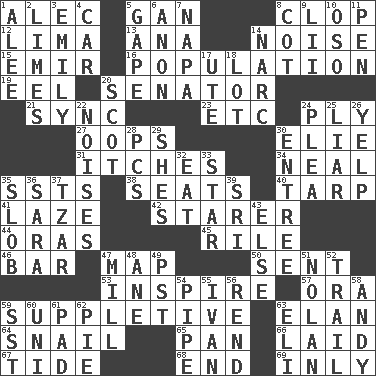 ACROSS 1. Actor Baldwin 5. Separate the seeds from cotton 8. Hoof sound 12. Pale green bean 13. Santa ___, CA 14. Annoying sound 15. Arab leader 16. Census information 19. Snakelike fish 20. Elected representative 21. Synchronize (abbr.) 23. And so on (abbr.) 24. Apply oneself diligently 27. I made a mistake 30. Writer Wiesel 31. Strong, restless desires 34. Anneal 35. Fast planes 38. Theater features 40. Canvas cover 41. Goldbrick 42. A viewer who gazes fixedly 44. Mouths or openings 45. Cause heat under the collar 46. Drinking establishment 47. Atlas unit 50. Emitted 53. Heighten or intensify 57. Mouth or opening 59. Supplementary 63. Flair 64. Slow-paced one 65. Baking dish 66. Put down 67. Event that recurs at intervals 68. Conclusion 69. Inwardly DOWN 1. Toward shelter 2. Citrus fruits 3. Poet Dickinson 4. Automobile 5. Open wide 6. At once, immediately (arch.) 7. California wine valley 8. Small bed 9. Cards in a Roman deck? 10. Bear (Spanish) 11. Writing instrument 14. Drug cop 17. Shoshoni 18. Car dealer's back yard 20. Native of Scotland 22. Annoying sounds 24. Entreaty 25. One who doesn't tell the truth 26. Sharp bark 28. Personal Computers (abbr.) 29. "______ My Girl" (Turtles hit) 30. Main course 32. Consume 33. Play the lead 35. Oscar Madison type 36. "Two Mules for Sister ____" 37. Czar 39. _ Lanka 43. Otherwise 47. Place where flour is made 48. One (Scot) 49. Pacific Standard Time (abbr.) 51. Pitcher Ryan 52. Go after with the intent to catch 54. Corncob 55. "Terrible" tsar 56. Tear apart 58. "60 Minutes" Commentator Rooney 59. Fast jet (abbr.) 60. University (slang) 61. Groovy apt. 62. Sliced dessert 63. Biblical high priest