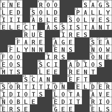 ACROSS 1. Compass dir. 4. Friend of Pooh 7. Sinks 11. Directed 12. Exchanged or delivered for money 13. Chummy 14. One more than two 15. Competent 16. Finds the solution 17. Opt 19. Aide 21. Regret 23. Angers 24. Conductor's collection 25. Grow older 26. Ocean 29. Film actor Errol 30. Followers of ems 31. At this time 32. Egg _ yung 33. Big collection agency 34. Single 35. Greek goddess of the dawn 36. _-fi 37. Goodbye (Sp.) 40. Mountains (abbr.) 41. Area sheltered from the wind 42. Monthly bill 43. Skim 45. Lizard (obsolete) 46. Conclusion 51. A person who is older than you are 55. Foolish or stupid persons 56. Globular water bottle used in Asia 58. "___ Maria" 59. Having high moral qualities 60. Prepare for publication 61. _ de Janeiro 62. Celtic language 63. Turn to the right 64. Raised railways DOWN 1. Writer Wiesel 2. Famous astronaut Armstrong 3. Singer Brickell 4. Director Reiner 5. Spanish pot 6. Lyric poems 7. Table seasonings 8. Inventor's middle name 9. Small, secluded valley 10. System (abbr.) 12. Titan orbits this 13. Airs 16. Male parents of animals 18. Supercomputer manufacturer 20. Omens 22. Car or cant ending 24. Soft thread for cleaning between teeth 25. Nest on high 26. Snob 27. Immeasurably long periods of time 28. Deep reverence 29. 12 inches 32. Opposite of masc. 33. Ancient Celtic tribe of eastern Britain 36. Narrow boards 37. "We ___ not amused" (Victoria) 38. Outscore 39. International (abbr.) 43. Fur scarf 44. Quote 46. Trig term 47. Scent 48. Teases 49. Cassini of fashion 50. Thickened enlargement 52. Have the gumption 53. Morally bad or wrong 54. Vintage cars 57. Neckwear