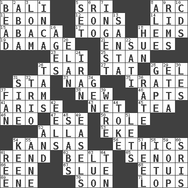 ACROSS 1. Indonesian resort city 5. Indian title of respect (Mr.) 8. Curve 11. Inky black, to poets 12. Immeasurably long periods of time 14. Hat (slang) 15. Phillipine bananalike plant 17. Ancient Roman robe 18. Folds over and sews together 19. Break 21. Takes place subsequently 23. Biblical high priest 25. Comedian Laurel of Laurel & Hardy 26. Russian ruler of old 27. Make lace 28. Set 31. R.R. building 33. Tired old horse 35. Feeling or showing extreme anger 37. Unshakable 38. ___ Haven, CT 40. Tenement units (abbr.) 41. Originate 43. Remaining after all deductions 45. Afternoon social gathering 46. Modern: prefix 47. Compass dir. 50. Hero or heavy, e.g. 52. Silent film actress Nazimova 53. Make supply last 54. Sunflower state 56. Principles of right and wrong 61. Tear apart 62. Waist strap 65. Sir (Sp.) 66. Car or cant ending 67. Change direction abruptly 68. Needle case 69. Compass dir. 70. Male offspring 71. Chops off DOWN 1. Necklace unit 2. Swedish rock group 3. Rich soil 4. South American Indian 5. Put into a specified state 6. Friend of Pooh 7. Consume 8. Toward shelter 9. Basketball hoops 10. Music discs 13. Before Barbara or Clara 16. Matures 18. Attila the _ 20. Enthusiasm 22. Suttee (variant) 24. SW Asia republic 26. Scottish caps 28. Stare wonderingly 29. Singer James 30. French article 31. Male parent of an animal 32. Musical group of three 34. Commissioned military rank (abbr.) 36. Assign a rank or rating to 37. Air blower 39. We are 42. Snakelike fish 44. Puff or smoke 48. Broad, flat, thick pieces 49. Artist's stands 51. Allows 52. Plus 54. Peachy ____! 55. Queen of England 1702-14 57. Person who is morally reprehensible 58. To the inside or interior of 59. Overturn; upset 60. Indian titles of respect 61. To sift 63. Nilotic language 64. Nine, plus one
