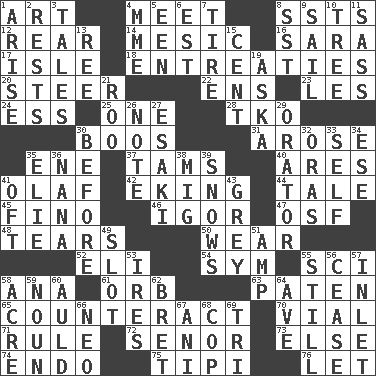 ACROSS 1. Nonscientific branch of learning 4. Rendezvous 8. Fast planes 12. Located in or toward the back 14. Mesonic 16. "Two Mules for Sister ____" 17. Capri or Wight 18. Pleas 20. Navigate 22. Followers of ems 23. French article 24. Double-curved letter 25. Single 28. Ring climax 30. Expressions of contempt or scorn 31. Came up 35. Compass dir. 37. Scottish caps 40. Ancient Greek god of war 41. Norwegian king 42. Supplementing with great effort 44. Story 45. Fine (Spanish) 46. Composer Stravinsky 47. Order of Saint Francis (abbr.) 48. Pulls into pieces 50. Erode 52. Biblical high priest 54. Symbol (abbr.) 55. _-fi 58. Santa ___, CA 61. Globe 63. Eucharist need 65. Frustrate 70. Small bottle 71. Court order 72. Sir (Sp.) 73. Otherwise 74. Inside; within (prefix) 75. Native american tent (variation) 76. Allow DOWN 1. Ascend 2. Musical pauses 3. Stories 4. Madame (abbr.) 5. Car or cant ending 6. Eastern Standard Time (abbr.) 7. Hoop that covers a wheel 8. Fast jet (abbr.) 9. Move on water 10. Family _ (genealogy) 11. Backtalk 13. To sift 15. Penny 19. "____ silly question..." 21. Friend of Pooh 26. Observe 27. 1973 Nobel Price Winner (Physics) Leo 29. Speaker 30. Prior to 32. Mouths or openings 33. Oneself 34. Compass dir. 35. Writer Wiesel 36. Grandmother 38. Russian fighter aircraft 39. Overwhelms 41. Often (poetically) 43. Jennifer or Joel 49. Position in a hierarchy or organization 51. Electrical Unit 53. Angers 55. Free of sound 56. Desist 57. An arm off of a larger body of water 58. 1/640 square mile 59. Part of speech 60. Old (Scot.) 62. Cy Young winner Saberhagen 64. "___ Maria" 66. Modern: prefix 67. Black tropical American cuckoo 68. Police officer (slang) 69. Three (prefix)