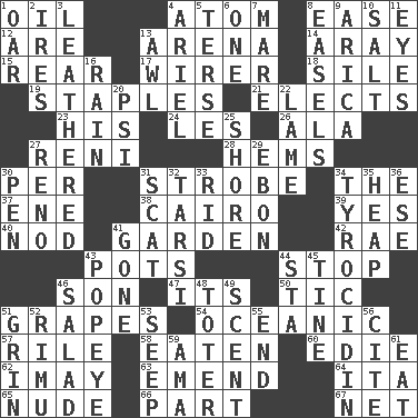 ACROSS 1. Lubricate 4. Smallest unit of an element 8. Comfort 12. "We ___ not amused" (Victoria) 13. Sports stadium 14. Like ___ of sunshine 15. Located in or toward the back 17. One who wires 18. Filth; sediment 19. Paper fasteners 21. Opts 23. Part of HMS, perhaps 24. French article 26. Chicken ___ king 27. Painter Guido (1575-1642) 28. Is hesitant and indecisive 30. For each 31. Disco prop 34. Definite Article 37. Compass dir. 38. Capital of Egypt 39. Affirmative reply 40. Allow head to fall sleepily 41. Place where plants grow 42. Actress Charlotte 43. Cooking vessels 44. Discontinue 46. Manchild 47. ___ a Wonderful Life 50. Nervous spasm 51. Wine fruits 54. Pertaining to the sea 57. Cause heat under the collar 58. Ingested 60. Singer Brickell 62. "If ____ say so..." 63. Make improvements or corrections to 64. Call ___ day 65. Unadorned 66. Component 67. Fish or hair follower DOWN 1. Rowing implement 2. Angers 3. Resembling or made to resemble leather 4. Satellite of Uranus 5. Laconic 6. Single 7. Female horse 8. Artist's stands 9. N. Chile seaport 10. Table seasoning 11. Snake ____ (dice throw) 13. Leather borer 16. Precipitation 20. Air pressure measure (abbr.) 22. Unable to walk 25. Dinah or Pauly 27. Western Nevada city 29. Inky black, to poets 30. Writing instrument 31. Scram, to a cat 32. Tarsus (plural) 33. To free from 34. Polypeptide antibiotic 35. Pile 36. Compass dir. 41. Went 43. Wimpy's pal 44. R.R. building 45. Prong on a fork 46. Vegetable dish 48. Carrier 49. Odor 51. Smile widely 52. Tall New Zealand timber tree 53. Ooze 55. Conclusion 56. Quote 59. Housemaid (var.) 61. Consume