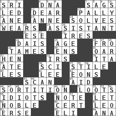 ACROSS 1. _ Lanka 4. Heredity factor (abbr.) 7. Sinks 11. Directed 12. Letter starter 13. Friendly 14. One (Scot) 15. Singer Murray 16. Finds the solution 17. Erodes 19. Aide 21. Compass dir. 23. Angers 24. Raised platform 25. Grow older 26. From 29. Makes less strong or intense 30. Followers of ems 31. Rowing implement 32. Layer 33. Big collection agency 34. Call ___ day 35. Had dinner 36. _-fi 37. Vertical member of a panel or frame 40. French article 41. Area sheltered from the wind 42. Immeasurably long periods of time 43. Examine hastily 45. Help 46. Casting lots 51. Plunders 55. Foolish or stupid persons 56. Observe 58. Allow 59. Impressive in appearance 60. Sure thing 61. Lion 62. Celtic language 63. Biblical high priest 64. Santa ___, CA DOWN 1. Cole _ (cabbage dish) 2. French philosopher Descartes 3. The content of cognition 4. Lair 5. Nanny 6. Ancient Greek god of war 7. Table seasonings 8. Inventor's middle name 9. Small, secluded valley 10. System (abbr.) 12. Small ungulate mammals of Africa 13. Introduce or present, as a question 16. Titles for men of rank and authority 18. 480, 500 or 516 sheets of paper 20. Public displays of written messages 22. Double-curved letter 24. Natives or inhabitants of Denmark 25. Nest on high 26. Fencing necessities 27. Assign a rank or rating to 28. Mouth or opening 29. Wig 32. Actor Linden 33. Ancient Celtic tribe of eastern Britain 36. Narrow boards 37. Ocean 38. Bathroom 39. _ china 43. Fur scarf 44. Quote 46. Trig term 47. Scent 48. Chest bones 49. Single time 50. Christmas carol 52. Water jar 53. Adolescent 54. Portico 57. Three (prefix)
