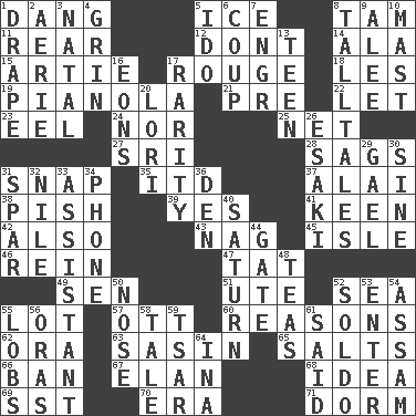 ACROSS 1. Mild oath, euphamism for damn 5. Frozen water 8. Scottish cap 11. Located in or toward the back 12. Do not 14. Wing 15. Nick name for Arthur 17. Makeup applied to the cheeks 18. French article 19. Player piano 21. Before (prefix) 22. Allow 23. Snakelike fish 24. Not either 25. Remaining after all deductions 27. _ Lanka 28. Settles 31. Fastener 35. It would 37. Jai _ 38. Expression of disdain 39. Consenting reply 41. Peachy ____! 42. In addition 43. Tired old horse 45. Capri or Wight 46. It's straight from the horse's mouth 47. Make lace 49. Elected rep. 51. Shoshoni 52. Ocean 55. Car dealer's back yard 57. Baseball player Mel 60. Thinks logically 62. Mouth or opening 63. Indian antelope 65. Table seasonings 66. Bar 67. Flair 68. It may be bright or harebrained 69. Fast jet (abbr.) 70. Period 71. Dormintory (informal) DOWN 1. Window treatment 2. Nest on high 3. Brizilian seaport 4. Amused look 5. Wedding promise 6. Clever action or accomplishment 7. Engineer (abbr.) 8. Baron Munchausen's specialties 9. Toward shelter 10. Vertical spar for supporting sails 13. Adolescent 16. Immeasurably long periods of time 17. Noteworthy scarcity 20. Australian parrot (variant) 26. 1973 Nobel Price Winner (Physics) Leo 29. Highlander 30. Trig term 31. Coast Guard woman 32. "Death on the ____" 33. Aide 34. Give a jingle 36. Lair 40. Titan orbits this 44. Yard entry 48. Beverages made from leaves 50. Olfactory organ 52. Twentieth part of a lira 53. Keyboard key 54. Indian state 55. Tennis shots 56. Mouths or openings 58. Story 59. Russian ruler of old 61. Alleged 64. _ tizzy (2 wds.)