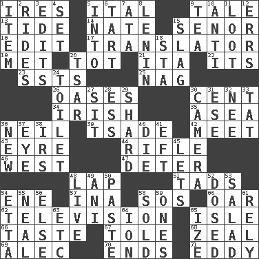 ACROSS 1. Angers 5. Slanted text style (abbr.) 9. Story 13. Event that recurs at intervals 14. Nathan's nickname 15. Sir (Sp.) 16. Prepare for publication 17. Interpreter 19. Was introduced to 20. Small child 21. Call ___ day 22. It is 23. Fast planes 25. Tired old horse 26. Fertile tracts in a desert 30. Penny 34. From or relating to Ireland 35. Toward the sea 36. Famous astronaut Armstrong 39. Sadhe (variant) 42. Confront 43. Jane of fiction 44. Ransack; plunder; pillage 46. 270 degrees 47. Prevent from occurring 48. Infant locale 51. Small amounts or degrees 54. Compass dir. 57. _ tizzy (2 wds.) 58. Mayday 60. Boat paddle 62. Household entertainment appliance 65. Small island 66. Clothes sense 67. Lacquered or enameled metalware 68. Ardor 69. Actor Baldwin 70. Conclusions 71. Whirlpool DOWN 1. Detail 2. Amusement-park features 3. Prepares for publication 4. Put into a specified state 5. To the inside or interior of 6. Small pie 7. "One Day ___ Time" 8. Soviet premier 1918-24 9. Afternoon social gathering 10. Against 11. Spoils 12. Blunders 15. Volcanic refuse 18. R.R. building 20. Russian ruler of old 24. Bathroom 27. Be seated 28. Curvy letter 29. Pottery fragment 30. Device for capturing images 31. Compass dir. 32. Born 33. Make lace 36. ___ Haven, CT 37. Sight organ 38. Big collection agency 40. Pass on 41. Newt 45. Allows 48. Moving, as bait 49. Cuckoo 50. Thick mixture 52. Administered medicine 53. First course 54. Singer James 55. Anneal 56. Otherwise 58. Exchanged or delivered for money 59. Washington bills 61. Trust 63. And so on (abbr.) 64. Electrically charged atom 65. Ending with capital
